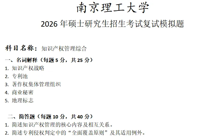 >南京理工大学知识产权管理综合考研复试真题模拟