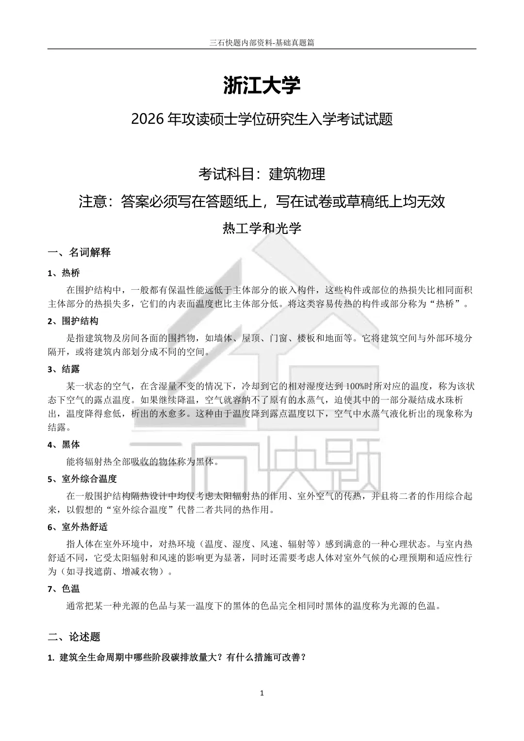 精准真题解析|浙江大学2026建筑学考研建筑技术方向-建筑物理详解(附全部答案)