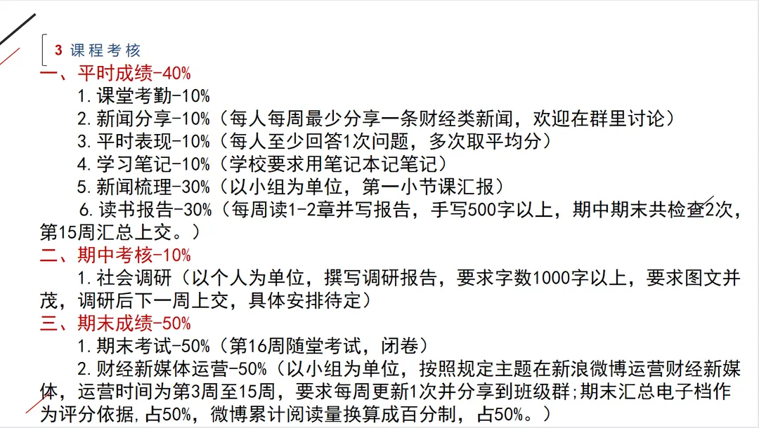 课程考核中,我要求他们每堂课上台做财经新闻的分享,并分组运营自己小组的财经新媒体,让他们尝试新媒体运营,培养他们的新闻敏感,希望能给他们不一样的课堂收获。
