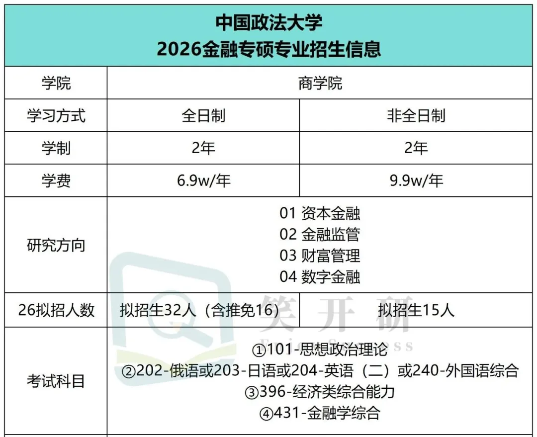 2.作为以法学为特色的“211工程”高校,中国政法大学金融专硕深度融合法学与金融知识,培养“金融+法律”复合型人才;