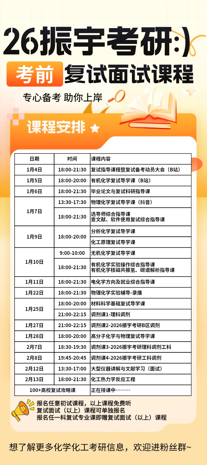 各位同学,振宇考研2026复试攻略课的专业课直播课表来啦,院校复试课课表正在加急安排中~(复试攻略课内容详见:2026振宇考研学校复试攻略课安排来啦!)