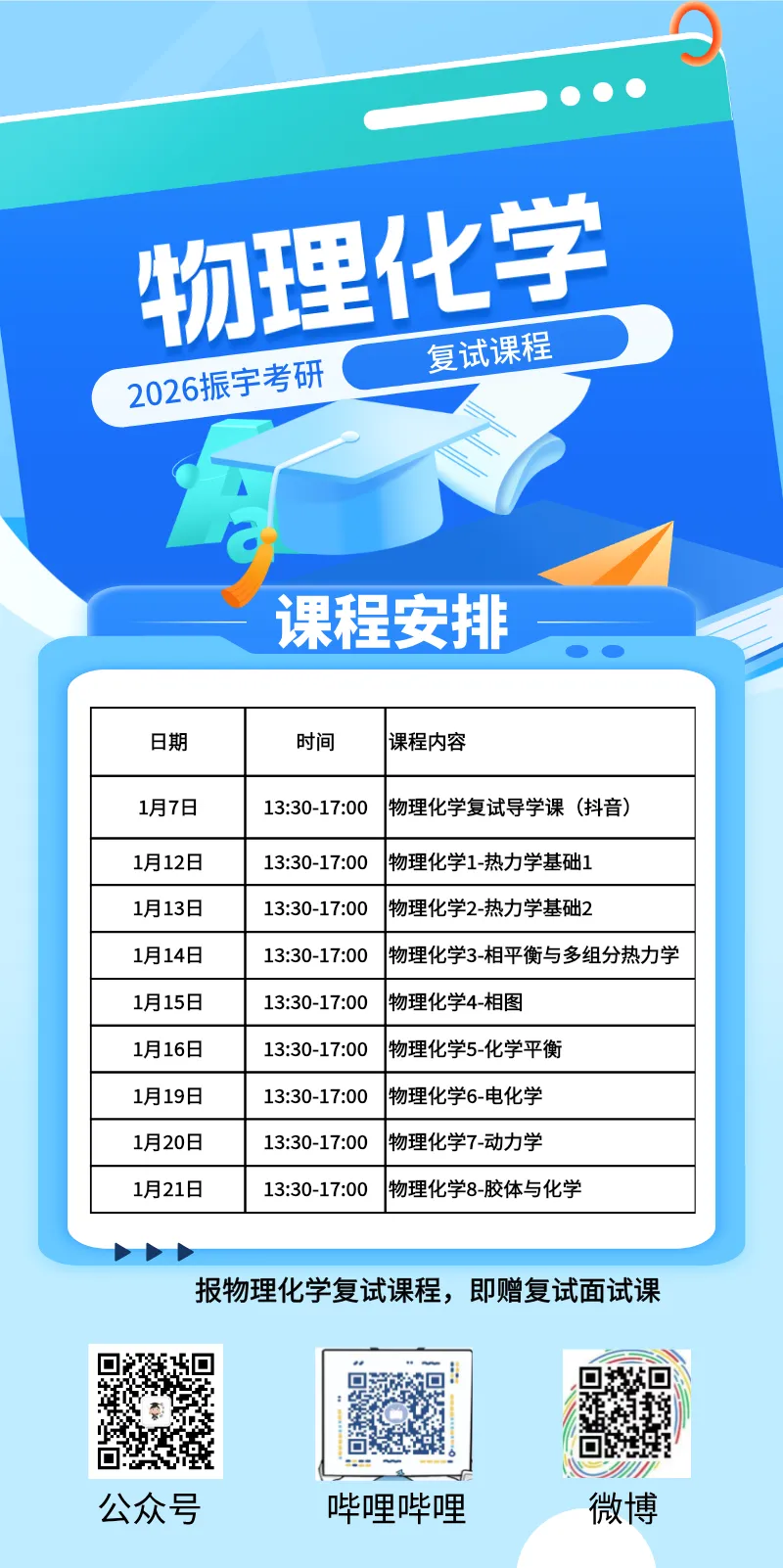 Q:报名复试笔试课程(如物化、有机...)会赠送复试面试课程吗?A:是的,报名任意一科复试笔试课程都会赠送复试面试课程。