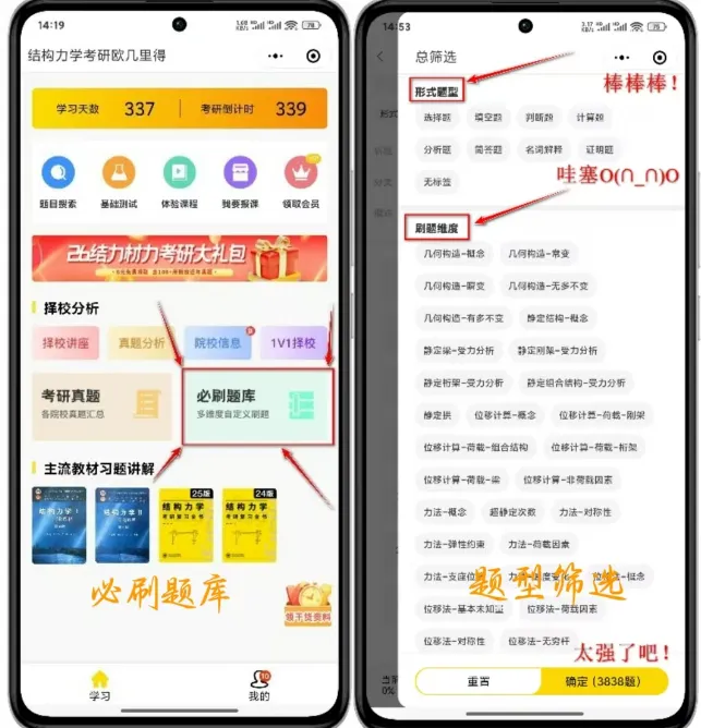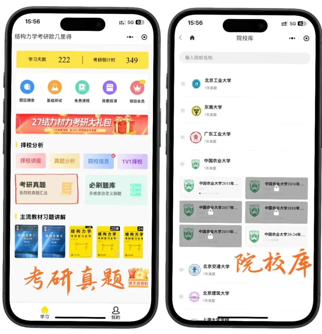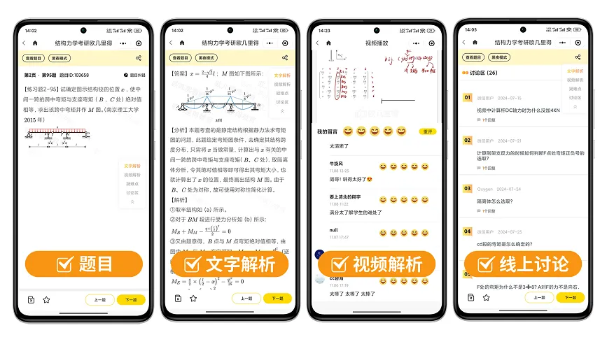 我们为你提供了更加智能的错题、收藏题和笔记题管理功能。你可以随时查看自己的错题集,巩固薄弱点;收藏自己喜欢的题目,方便日后回顾;记录自己的学习笔记,形成自己的知识体系。这些功能将帮助你更好地管理自己的学习资料,随时回顾和巩固所学知识。当我们系统学习过一遍结构力学这门课之后,就到了检验我们成果的时候,在主页点击考研真题即可进入真题模式:我们收集了90所院校的多年真题,开放了近5年的真题;你可以理解为,市面上较为热门的院校,在我们的系统内都有该校的真题,并且按照章节知识点有着详细的数据分析。