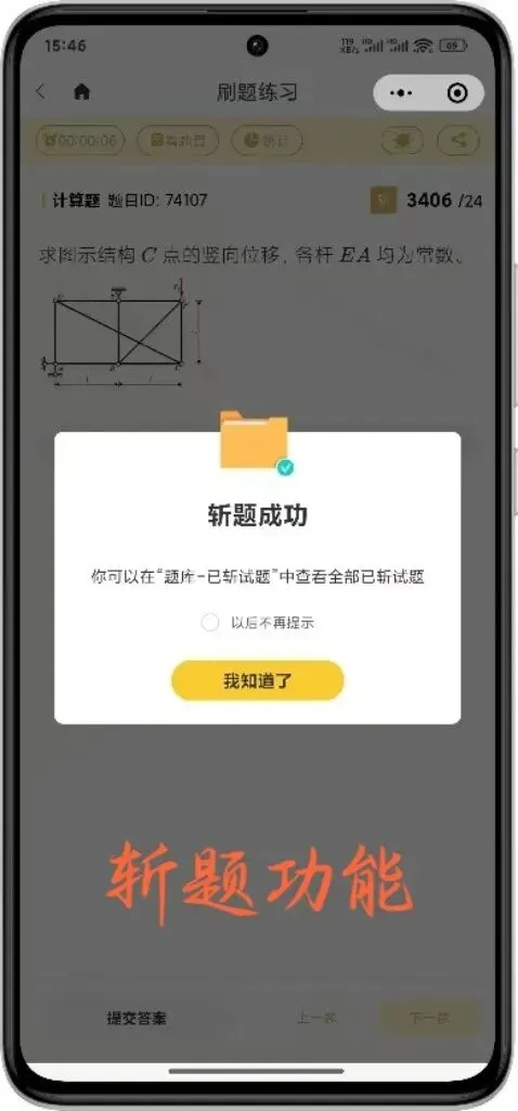 对于已经熟练于心的题目,我们也推出的斩题功能,已斩题目将自动过滤,让你更加专注于自己需要提高的题目。这样,你的刷题时间将更加高效,不再被已经熟练掌握的题目所浪费。