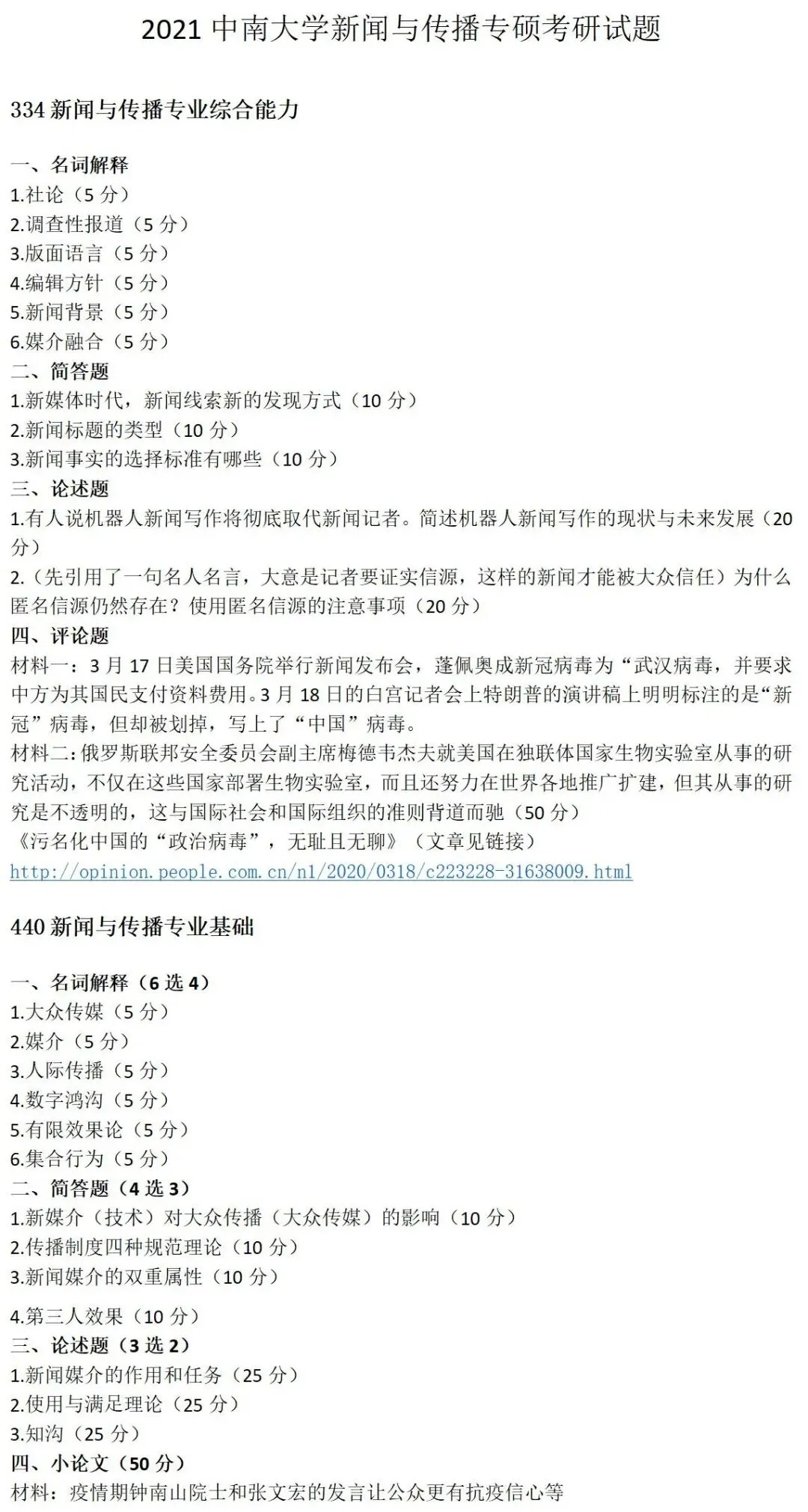 中南大学新闻与传播考研真题2021
