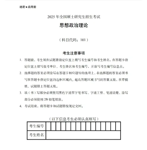 一、必带物品:准考证(已开始打印)、身份证、2-3支黑色签字笔、2B 铅笔、橡皮(建议准备一个透明文具袋,考前把需要物品全部放在一起)二、考试时间安排:2026年考研政治考试时间为12月20日8:30–11:30,共 3 小时。建议将时间合理分配:选择题(单选、多选) 50 分钟;材料分析题(5 题) 120 分钟;最后留10分钟检查。(政治材料分析题一般写了就有分,一定要结合材料写完,能写多少就写多少)重要提醒:千万不要违规!同一考场的考生很大概率是报考同一学校、同一专业。大家既是一起考试的考生,也在一定程度上是竞争对手。任何违规行为不仅会被监考发现,还可能被考场内的其他考生举报。