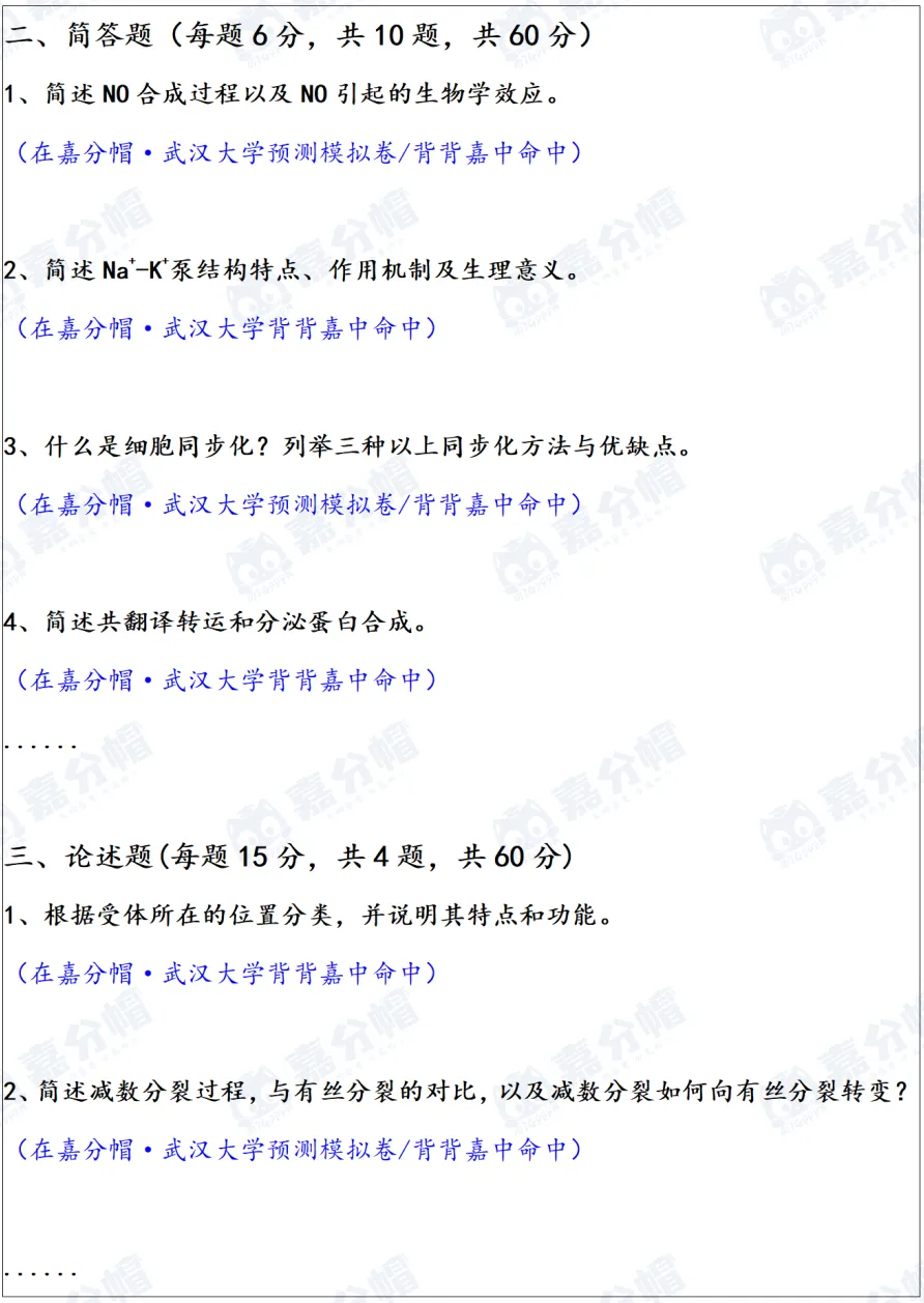 (1)和往年真题题型相比:武汉大学无官方公布考纲,历年题型无变化,固定为名解、简答和论述。