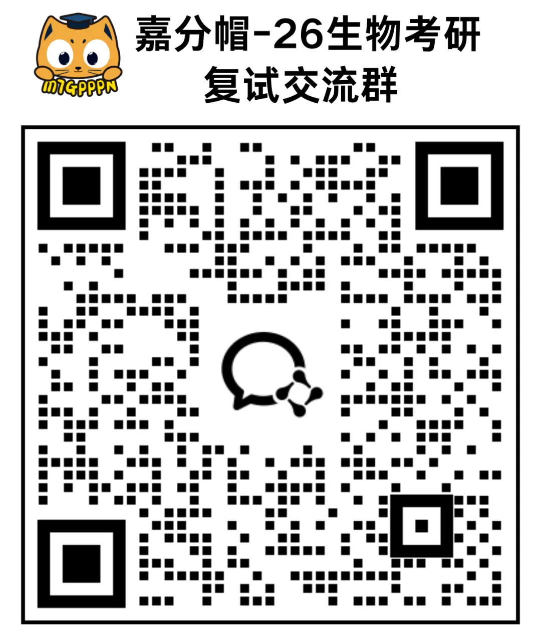 吐槽26初试、获取复试资料和信息、分享备考乐子......欢迎26生物考研er加入“嘉分帽26生物考研复试交流群”一起来开麦畅聊!也欢迎同学们进群讨论,补充真题呀!
