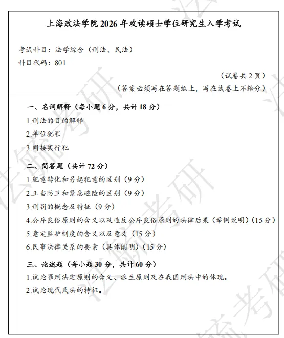 真题首发|2026上海政法学院法学硕士考研真题及参考答案(法学综合)
