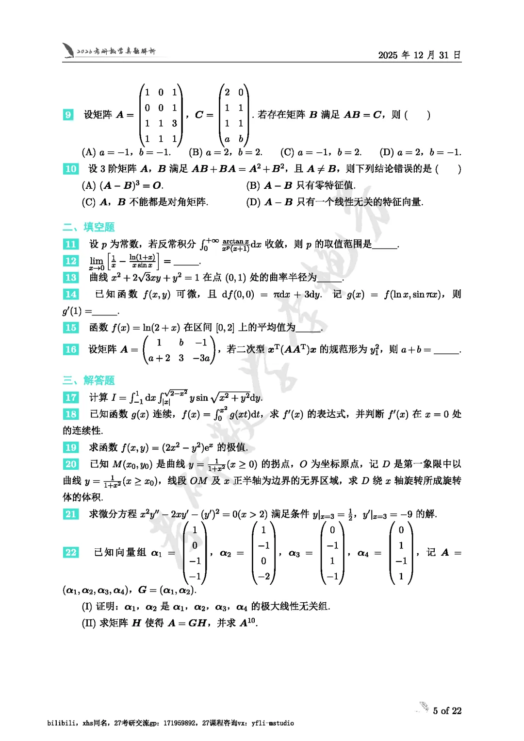 5道高数计算题要么非常单纯,比如第17题,第19题,第21题,要么非常典型,第18题(有非常接近的往年真题),第20题,拐点计算、旋转体的体积计算都是我们很熟悉的考点,因此,高数解答题部分对基础知识扎实,计算功底好的同学应该是相当友好的。
