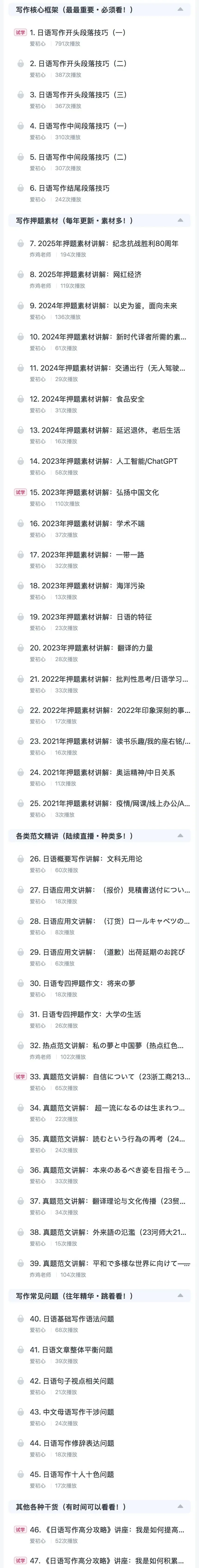 除此之外课程还包括了真题范文精讲以及押题素材,文章题材丰富,内容紧跟时事,多看多读、多练,积累到一定程度了,自然而然就会向外输出。