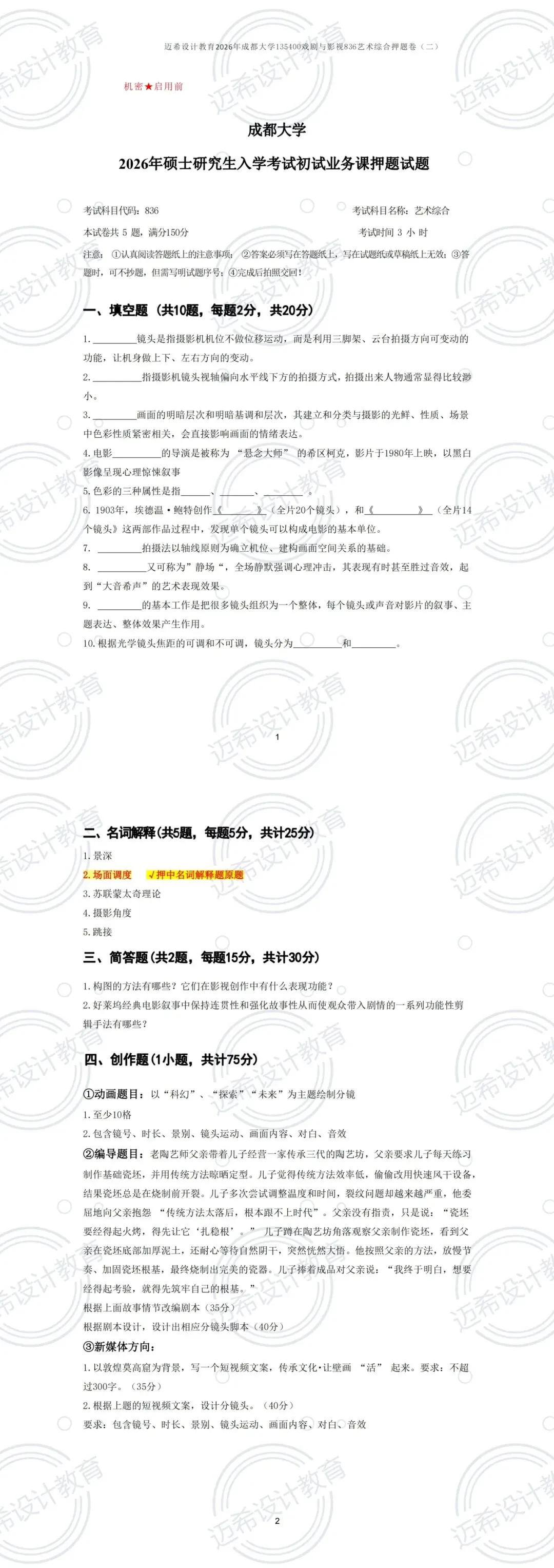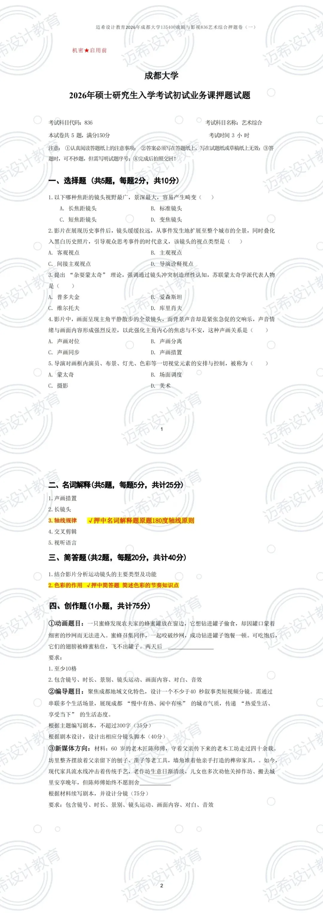 ✅ 名词解释 2 题押中原题:“场面调度”(押题卷二)、“180 度轴线原则”(押题卷一),背完直接默写得分!