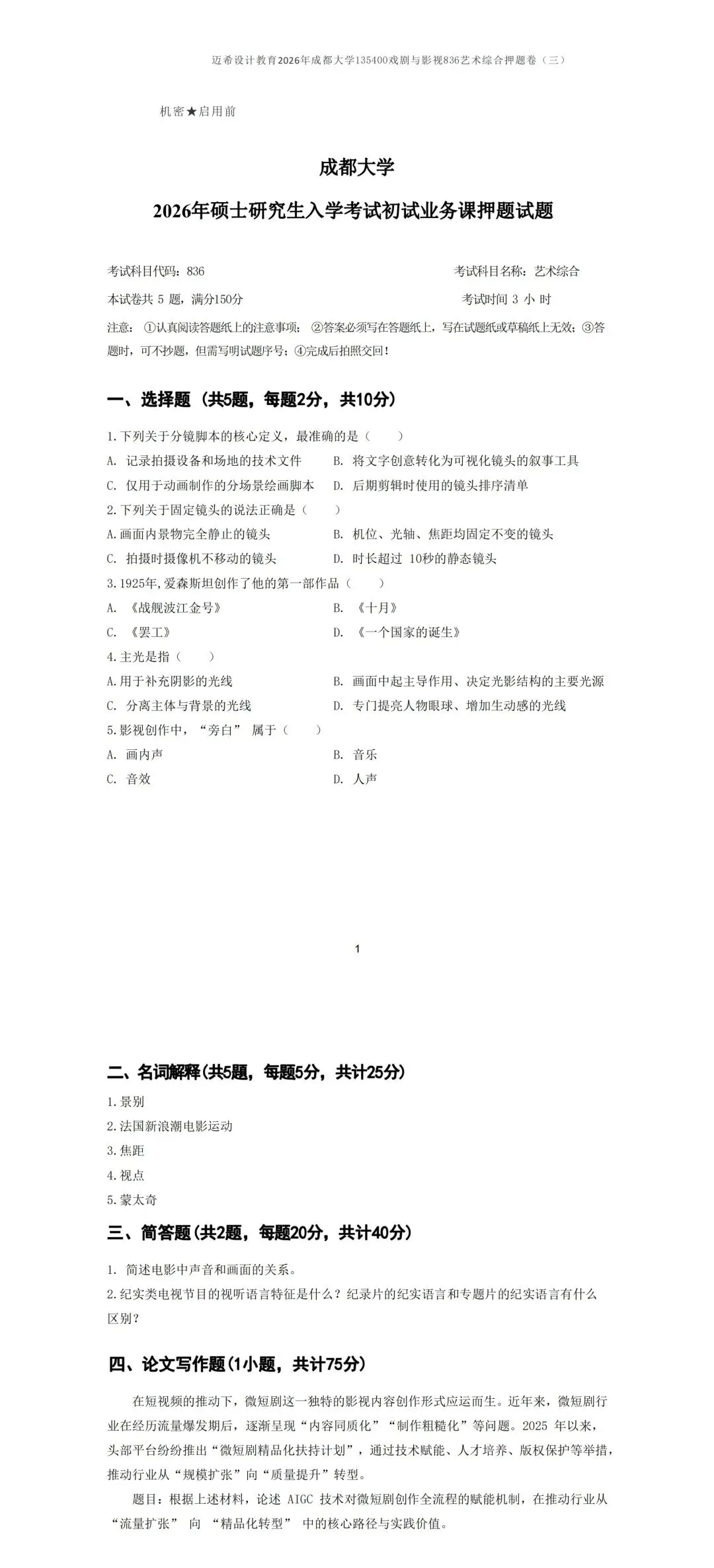 创作题:75 分(3 个方向选 1 个!影视动画 / 新媒体 / 影视编导)