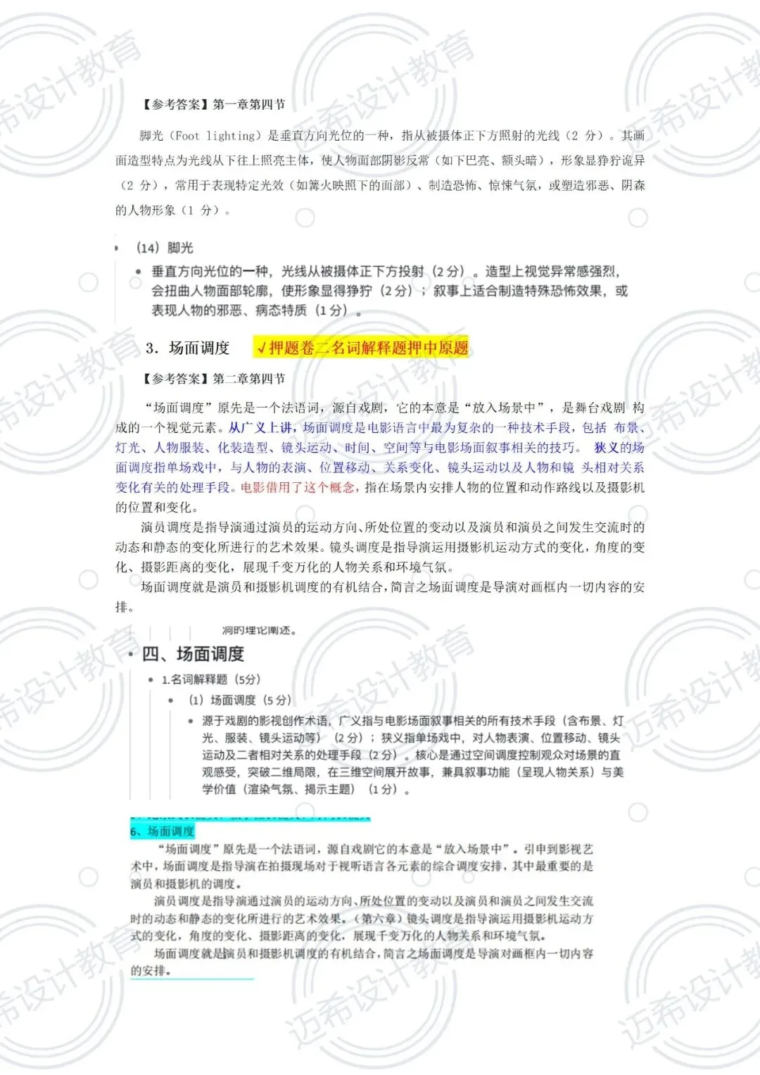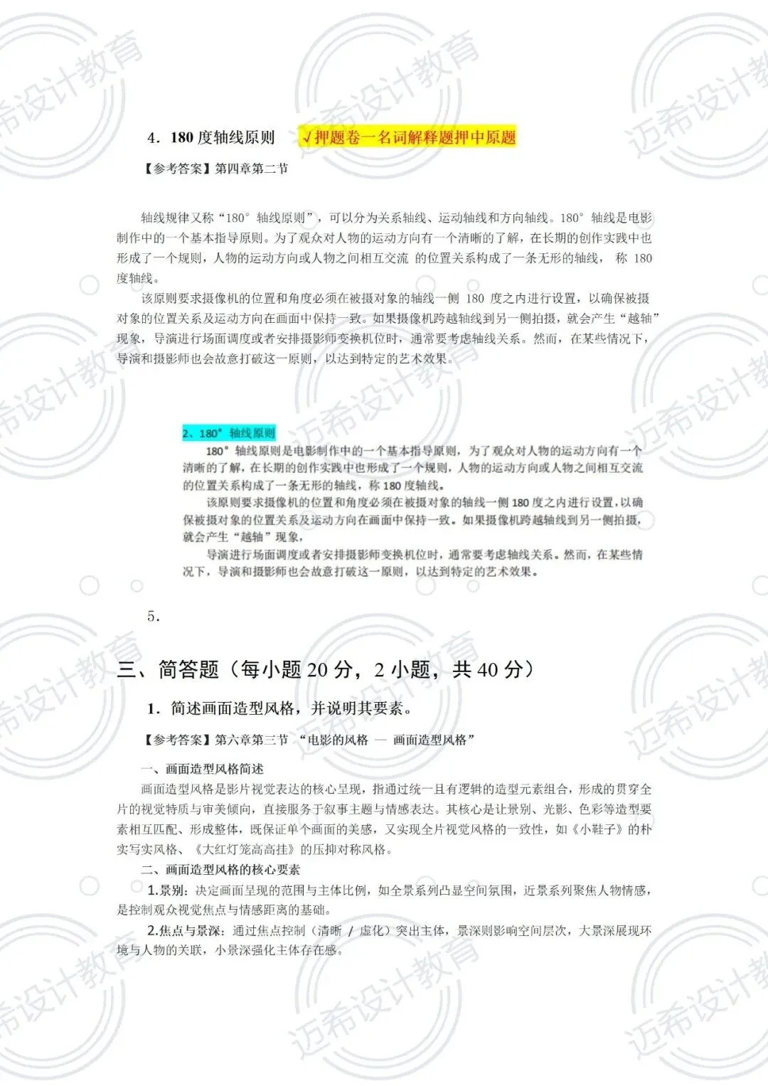 名词解释:5 题 ×5 分 = 25 分(考视觉设计、脚光、场面调度、180 度轴线原则等)