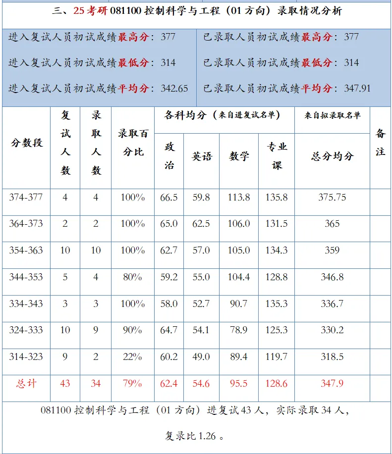 复试线314分,比24下降9分。其中录取最高分为377分,最低分为314分,平均分为348分。进入复试43人,实际录取34人,复录比为1.26。