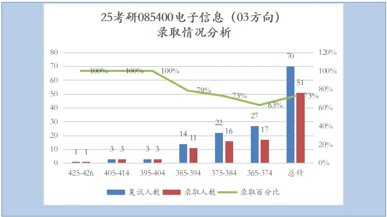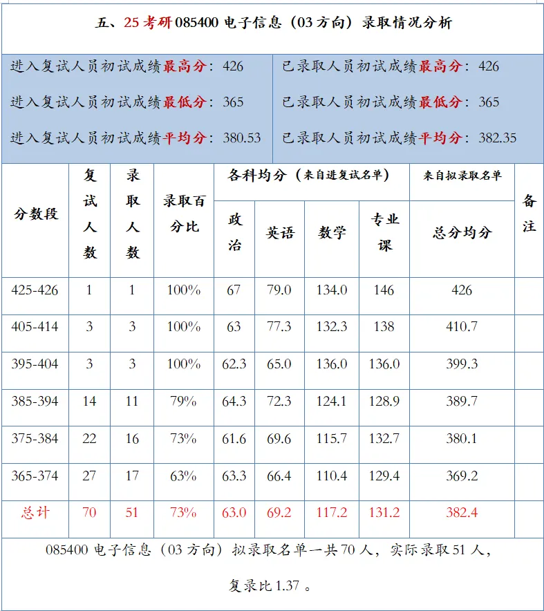 专硕复试线365,比24年上升55分!其中录取最高分为426分,最低分为365分,平均分为382分。进入复试70人,拟录取51人,复录比1.37!