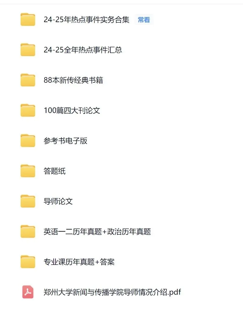 历年真题+近三年真题解析+50余篇导师论文+100篇热点论文+24至25全年热点事件汇总+24至25全年热点事件实务合集+导师介绍+专业课参考书电子版+80多本新传名著+英语一二、政治历年真题电子版+专业课电子版答题纸!
