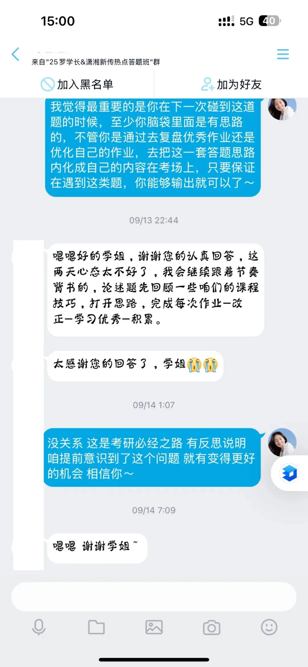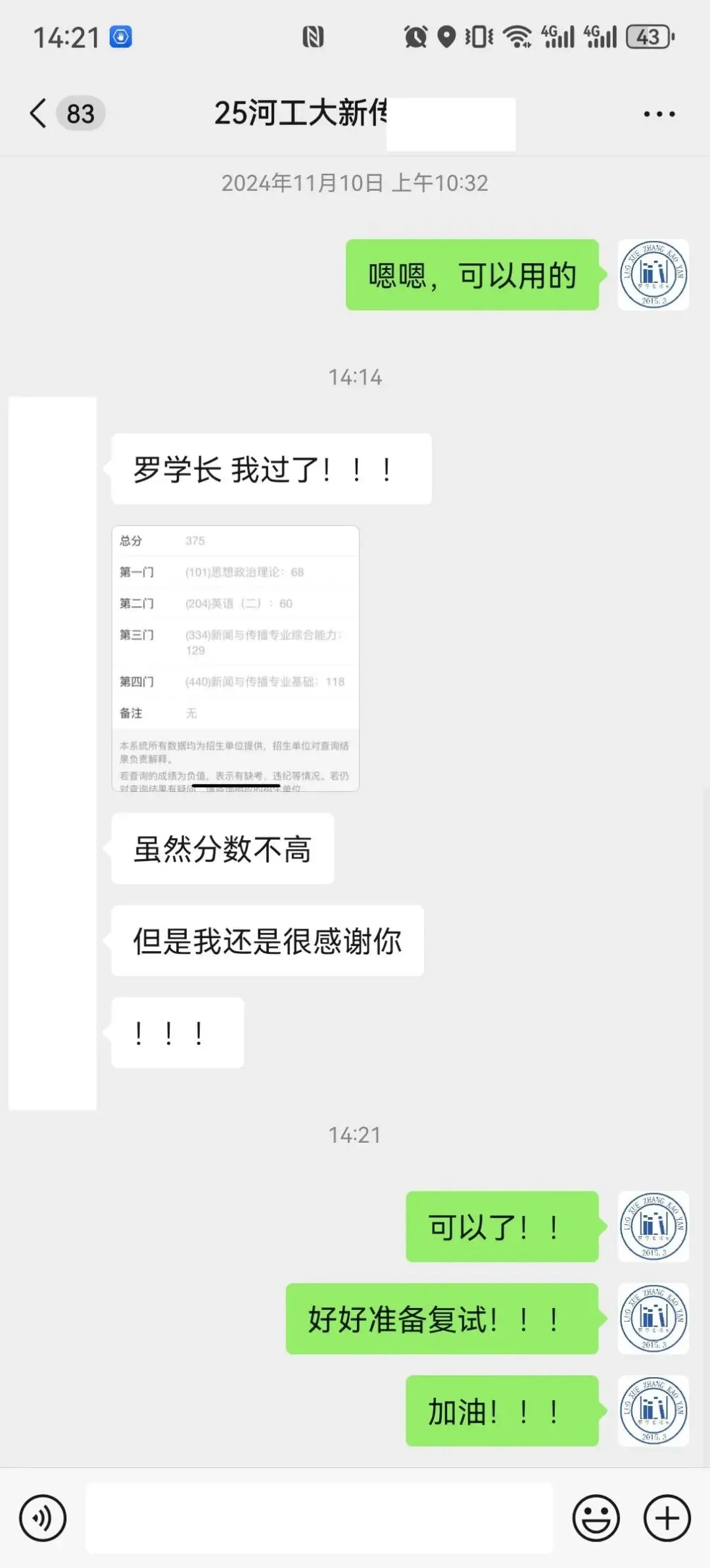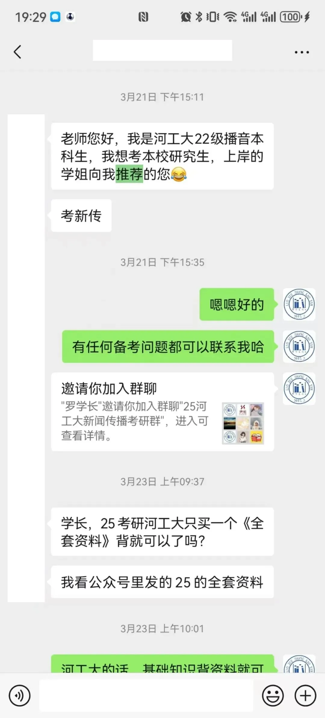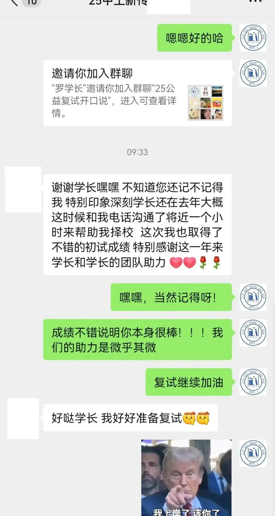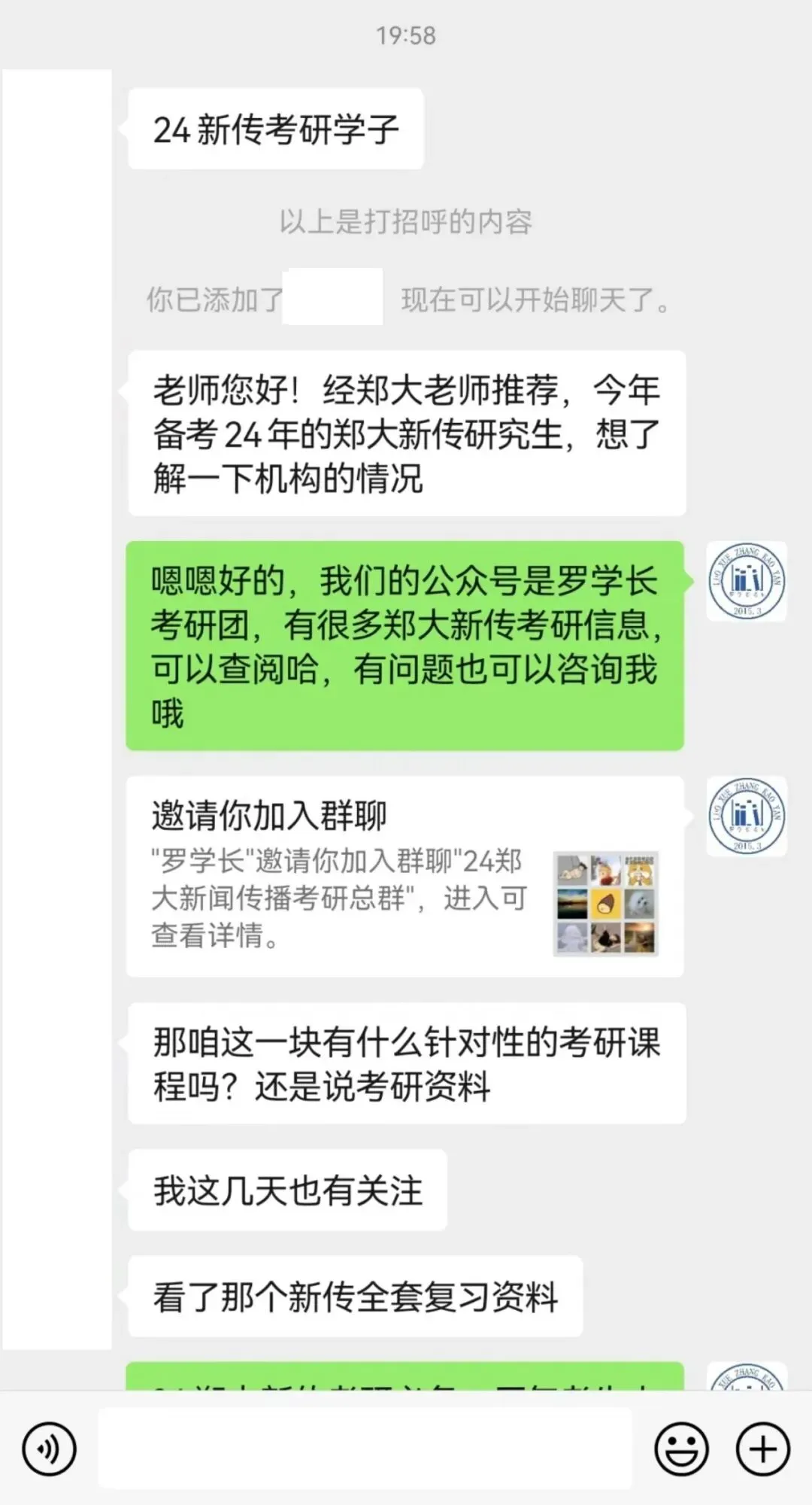 微信群是我们的主要阵营,学长学姐在群里分享新传考研资料,为同学们答疑解惑,同时每月进行一场免费辅导,指导大家复习,学弟学妹可加入以下所属微信群。