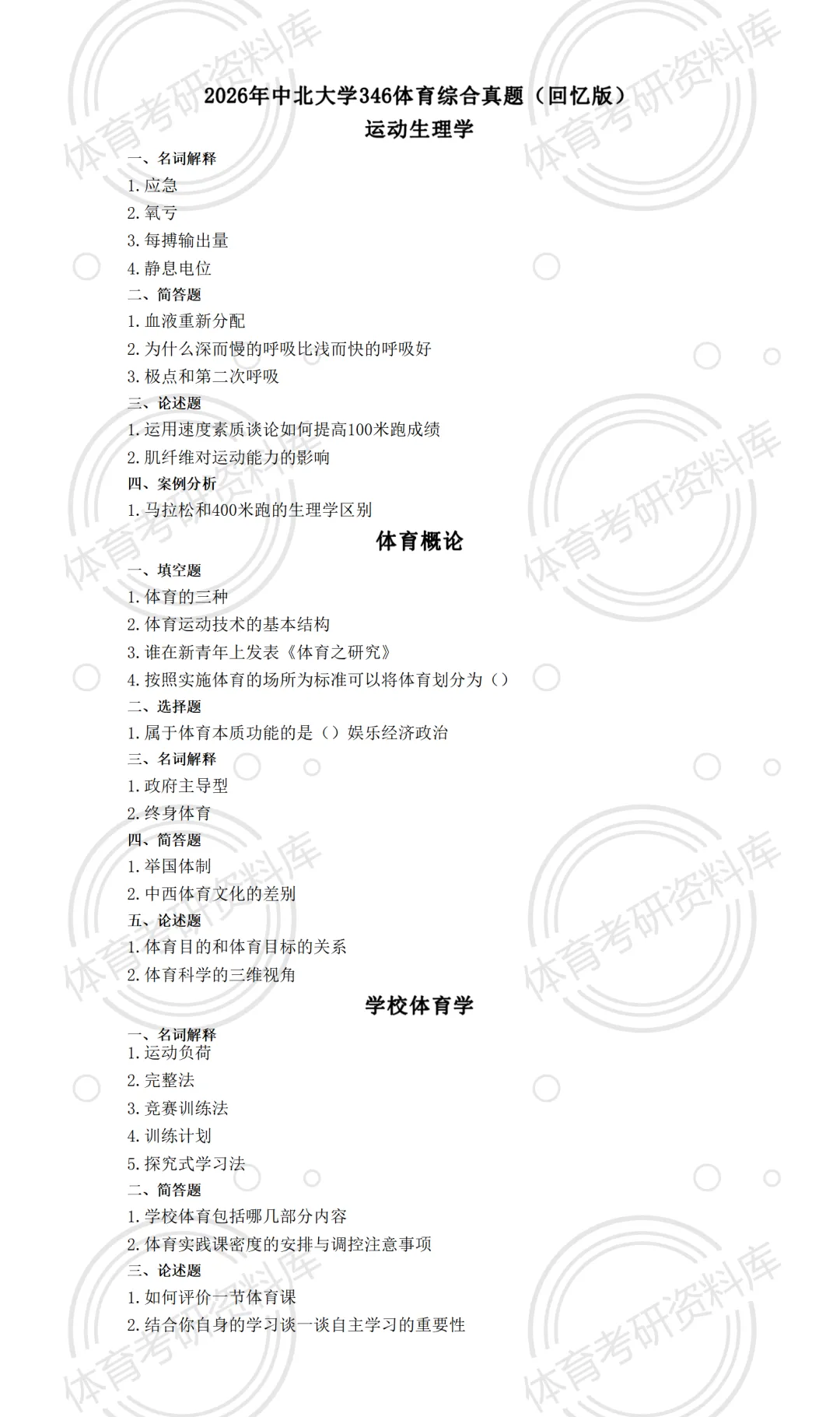 今天给大家分享的是中北大学346体育专硕考研真题考研真题(回忆版)仅供大家学习交流使用