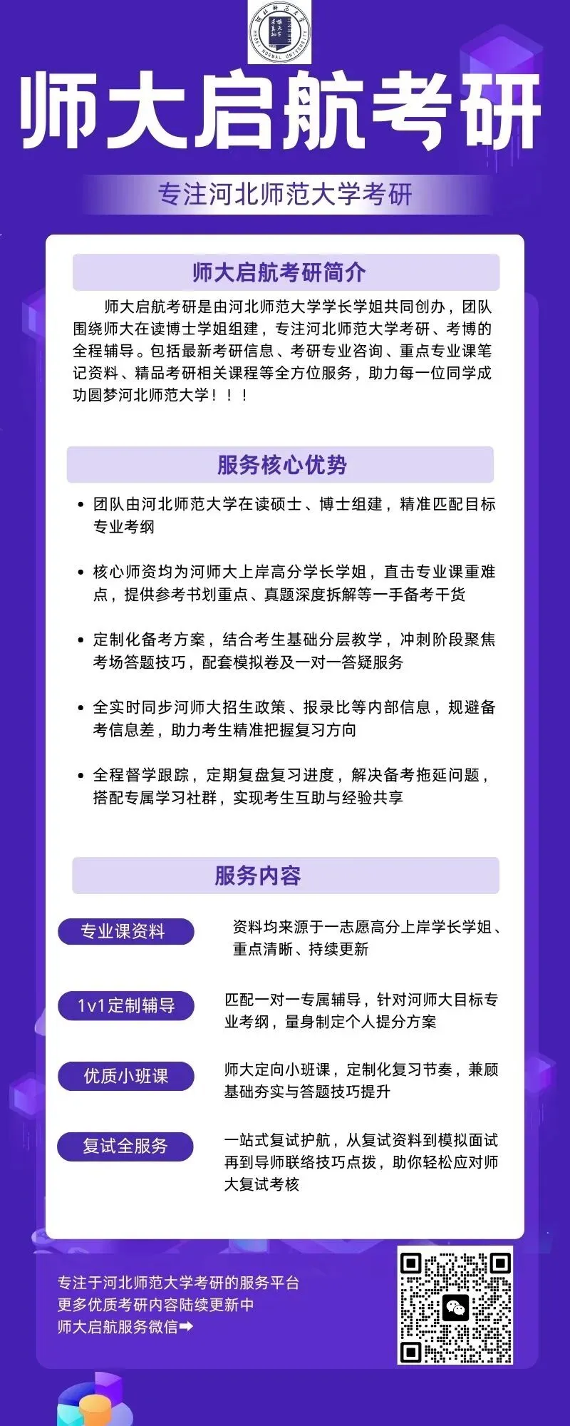 河北师大直系高分学长学姐一对一全程带学,紧扣专业课命题规律与重难点;系统讲解经典课后习题、剖析历年真题,快速提升解题得分能力;配备专属答疑,扫清学习障碍;同步内部考情动态,及时优化备考策略,精准锁定方向。