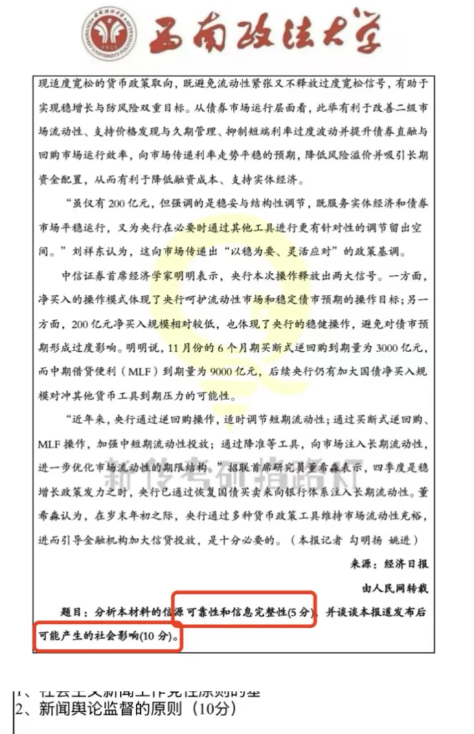 这道题我们在三模中几乎一模一样地练习过哦!相信认真复盘过试卷的宝宝们肯定在考场上游刃有余从从容容!第一小题从权威度、专业性、媒体背书等角度作答即可,第二道题类似于西政前几年常考的新闻评析,从结构、语言、主题等方面解读即可,第三道题也可以参考模考答案哦~