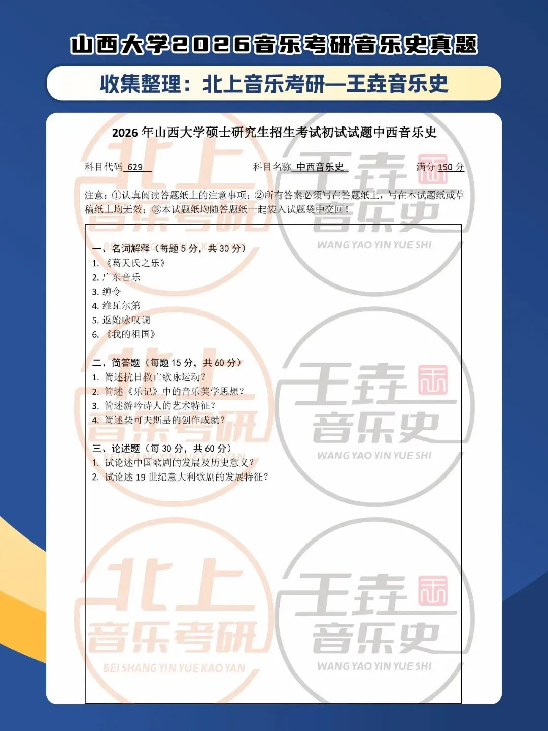 >山西大学2026音乐考研音乐史真题|北上音乐考研-王垚音乐史工作室收集整理