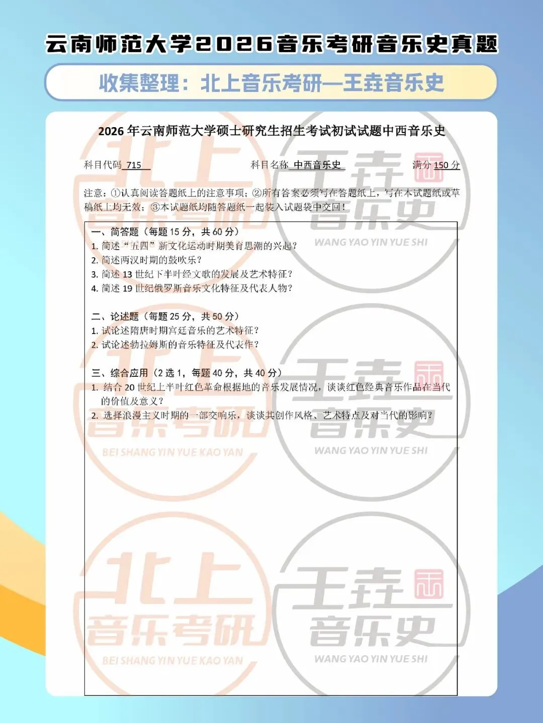 云南师范大学2026音乐考研音乐史真题|北上音乐考研-王垚音乐史工作室收集整理