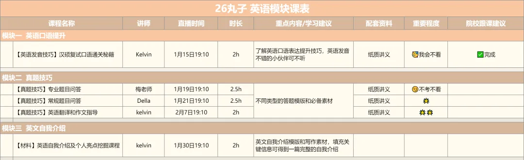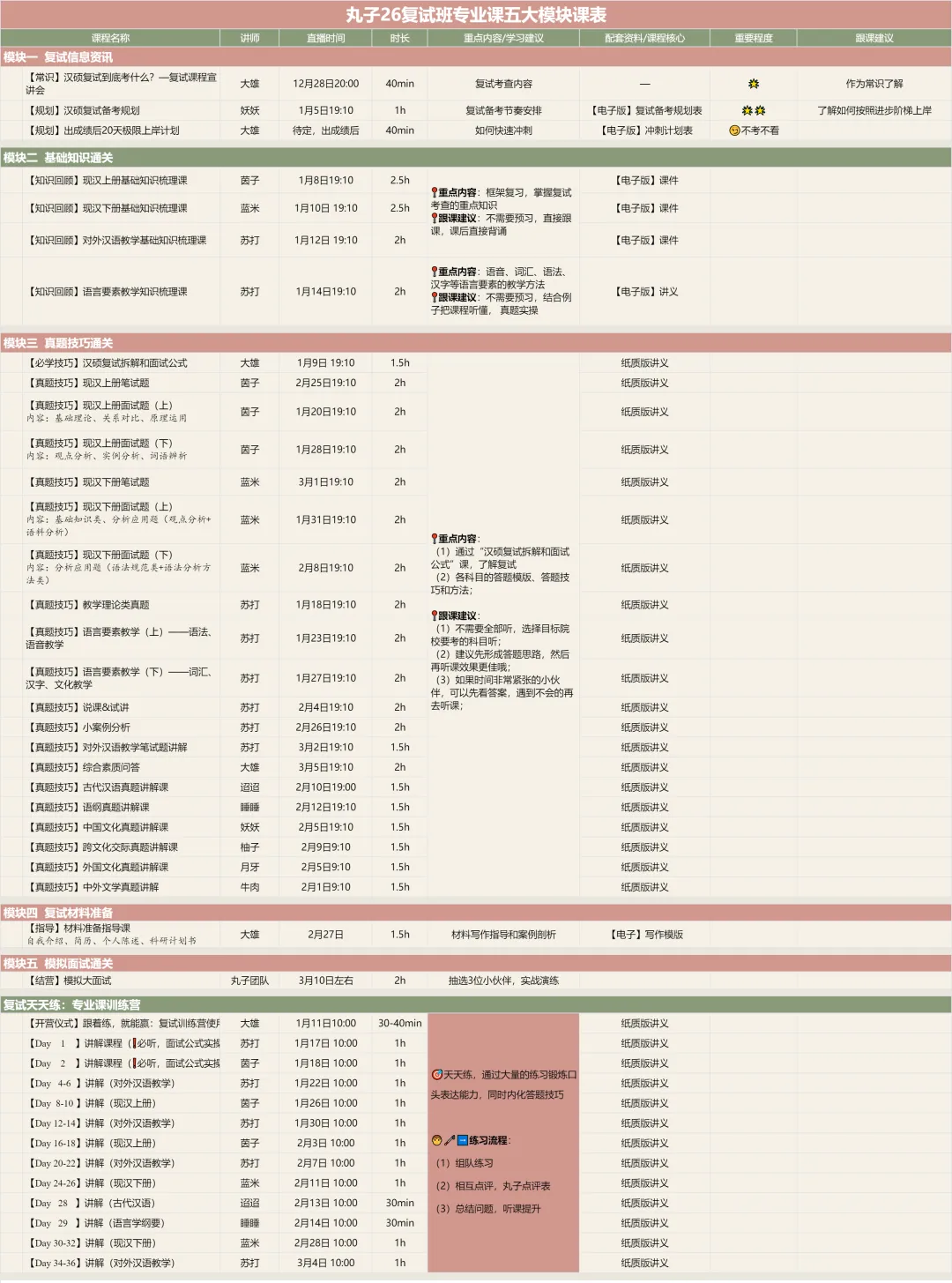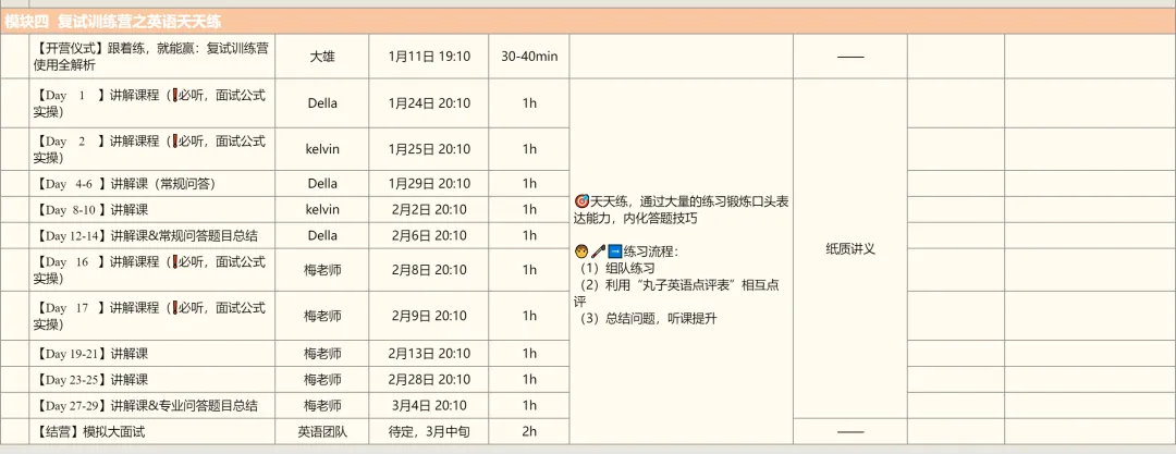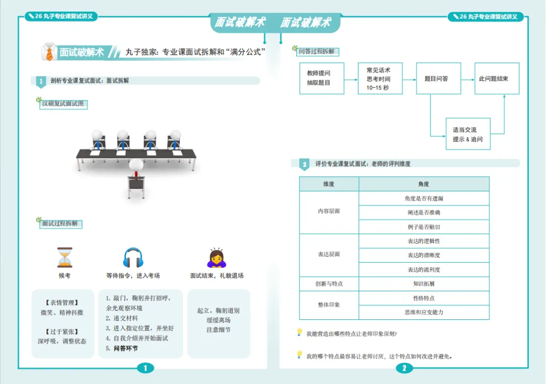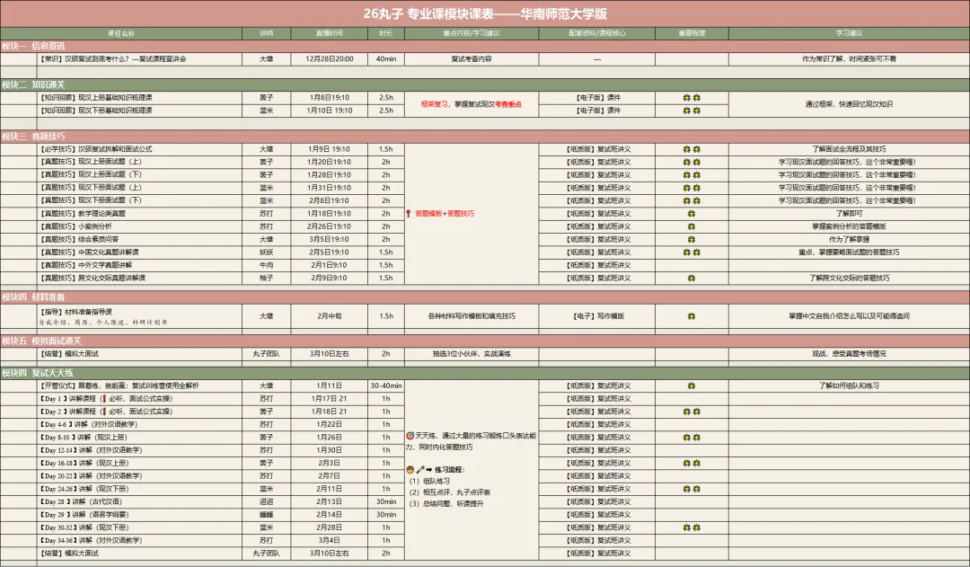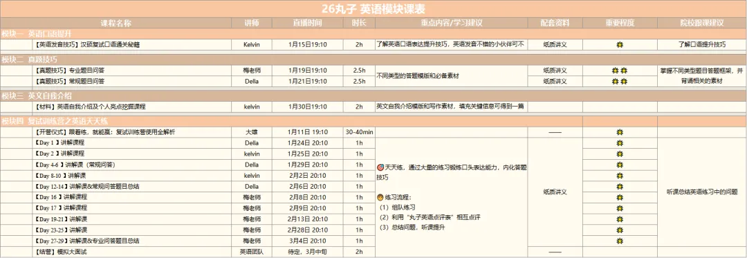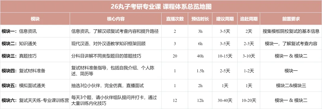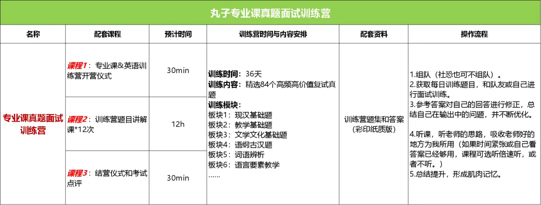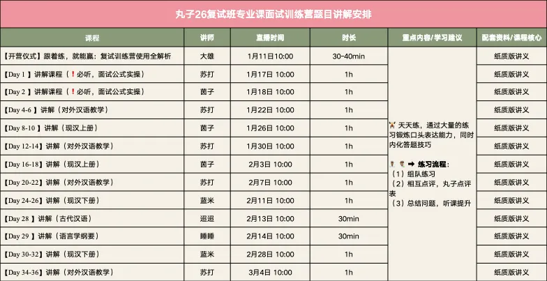 总体上,26复试班的体系包括五大模块+面试训练营两个核心,五大模块负责夯基,解决“脑瓜子”和“笔杆子”的问题,训练营是丸子复试班的“杀手锏”,解决“嘴皮子”的问题。(PS:英语是三大模块)