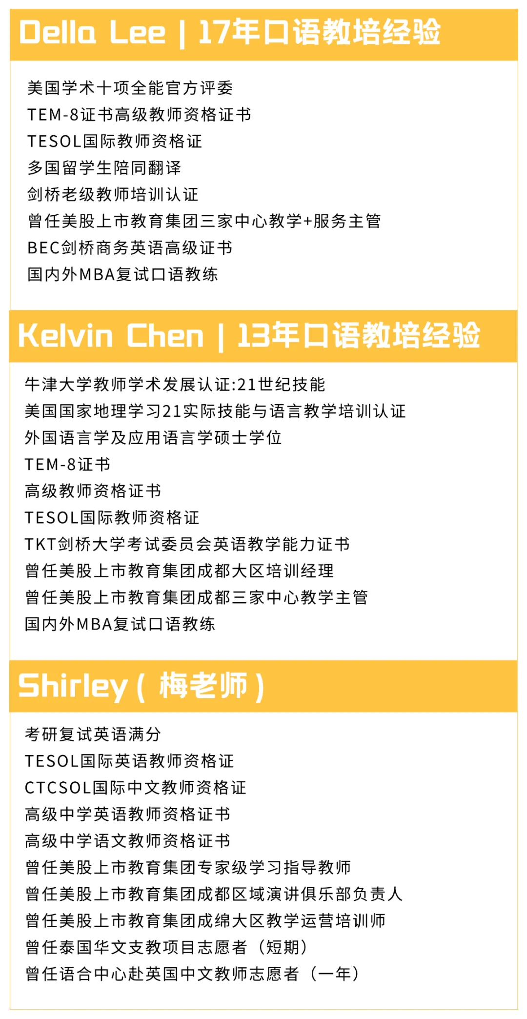 英语复试真题面试训练营有我们熟悉的Kelvin、Della和梅老师授课,他们都拥有超过10年的英语大型机构授课经历和能打的专业背景。