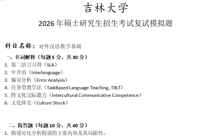 吉林大学对外汉语教学基础考研复试真题模拟含答案