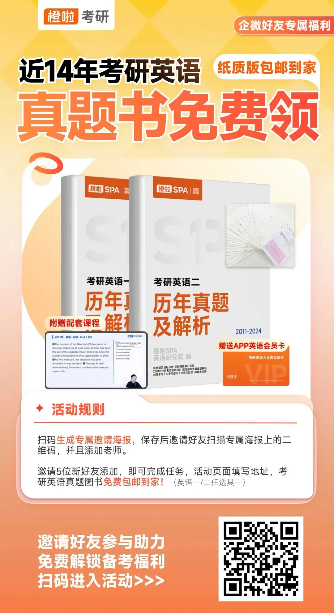 🎁包邮送!免费领考研英语真题图书🉐附赠配套讲解课程+APP英语会员卡🙋福利亲测有效!快来一起领!!!只需要简单三步就能解锁奖励👇1️⃣ 长按图片扫码生成专属海报2️⃣ 分享给朋友或朋友圈邀请助力3️⃣ 集齐助力,填写信息领取奖励🎯目前无需拼手速,参与就有机会!🎉很多宝子已经领到啦,你也赶快上车吧~👇长按扫码参与活动,生成你的海报👇