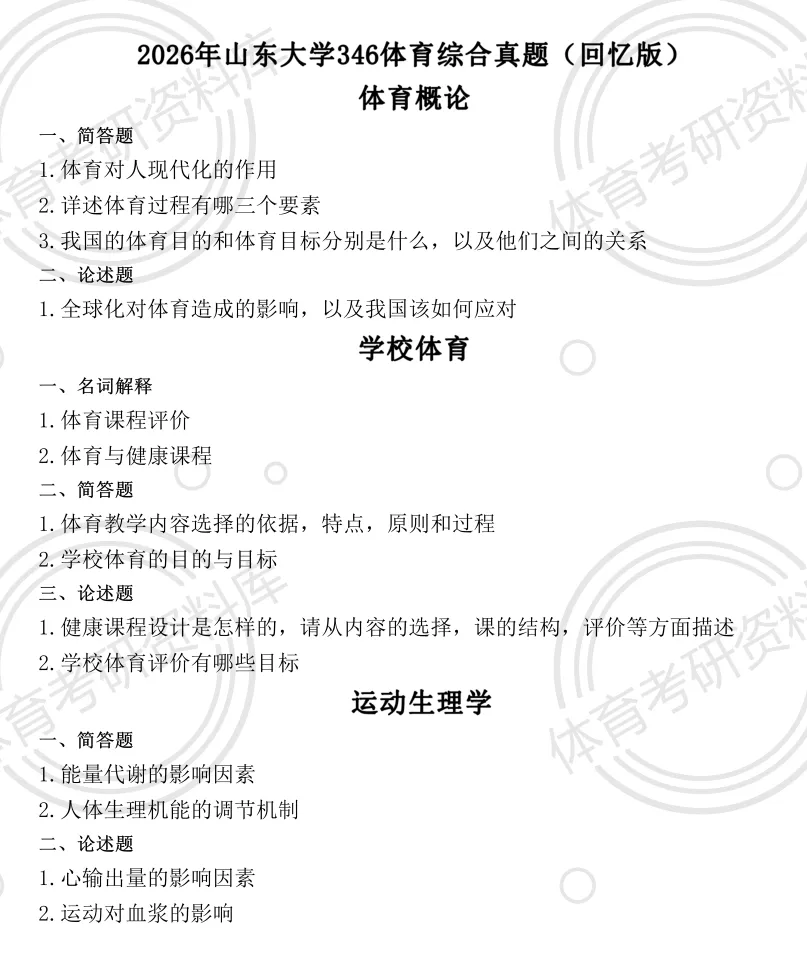 今天给大家分享的是山东大学346体育专硕考研真题考研真题(回忆版)仅供大家学习交流使用