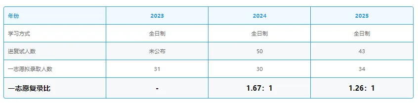👉🏻结合近年的数据,2024年1.67:1的复录比,意味着每1.67位进入复试的考生中仅有1人被录取,竞争强度显著高于前后年份。可能当年报考热度异常升高,导致进入复试的考生基数变大。2025年复录比大幅回落至1.26:1,可能报考热度回归正常,或进入复试的考生分数段分布更为合理。