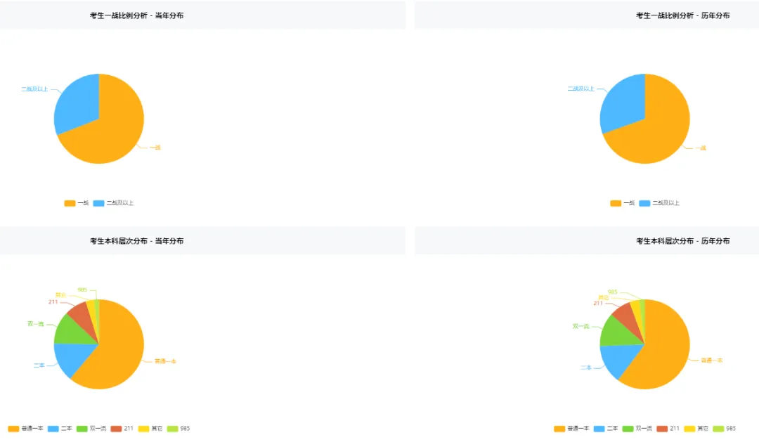 👉🏻一战 vs 二战比例(如:70% vs 30%),一战比例高,说明报考群体以应届生为主,竞争可能更“卷”初试分数,但复试经验可能相对弱一些。本科背景:985(2%)、211(8%)、双一流(10%)、二本(80%),普通本科考生占绝大多数。杭师大社工专业考生以应届生和普通本科为主,对跨考和背景一般考生较友好,复试重点考察专业基础与实务潜力,而非出身,适合“逆袭”!
