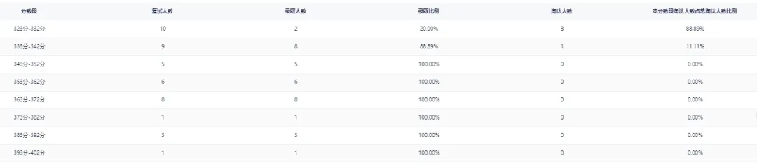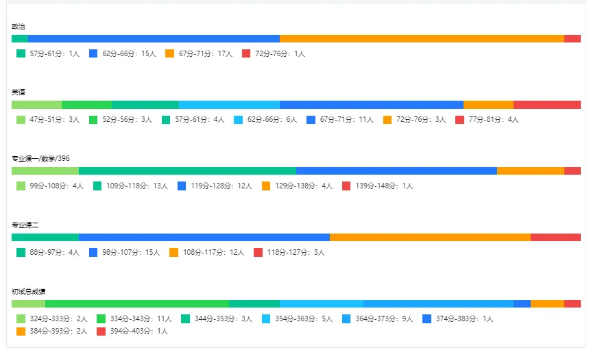👉🏻25年复录比为1.26:1(已去调剂和专项),从复试录取情况看,复试只淘汰了低分段的考生,对考生的初试成绩较为看重,没有复试照顾本校考生或对考生本科学校出身过于关注,学校相对比较友好👉🏻24年复录比为1.67:1(已去调剂和专项),从复试录取情况看,复试只淘汰了低分段的考生,对考生的初试成绩较为看重,没有复试照顾本校考生或对考生本科学校出身过于关注,学校相对比较友好👉🏻政治集中区间:62-71分(共32人,占94%),追求稳定在65-70分即可,不必过度投入,但需确保不拖后腿。英语集中区间:62-81分(共24人,占70.6%),是关键拉分科目,目标应定在65分以上,低于60分可能成为劣势。专业课一集中区间:109-128分(共25人,占73.5%)业课一是高分关键,必须稳在110-125分区间,争取130+拉开差距。专业课二集中区间:98-117分(共27人,占79.4%)专业课二普遍得分适中,目标应放在100-115分,注意避免低分。初试总成绩集中区间:334-373分(共28人,占82.4%)总分中位数区间:344-373分(共17人,占50%),是录取的密集区。