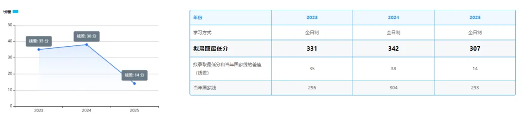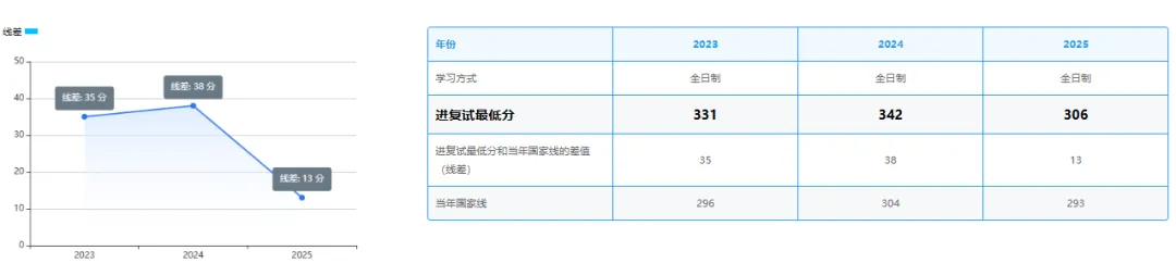 👉🏻根据近年的进复试最低分的变化,本硕士点的进复试最低分相对国家线呈下降趋势