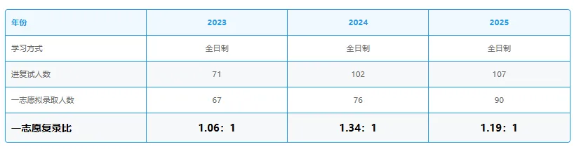 👉🏻2023年1.06:1竞争非常温和。2024年 1.34:1 竞争显著加剧,热度达到高点。复试变得关键且淘汰率提升,考生需在复试中有更出色表现才能脱颖而出。2025年 1.19:1 竞争热度略有回落,但已稳定在较高水平。比值虽较2024年下降,但仍明显高于2023年,表明竞争已进入新常态,复试仍需认真对待。大小年”波动模式显现:数据呈现了典型的“大小年”波动——2023年(小年,竞争小)→ 2024年(大年,竞争异常激烈)→ 2025年(热度回调,但仍属“中年”)。这对预测未来趋势有参考价值。