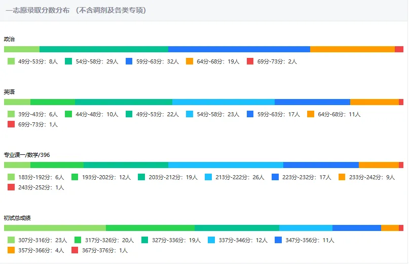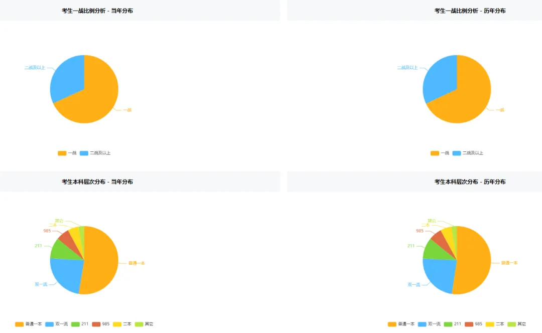 👉🏻无论 “当年” 还是 “历年”,一战考生都占绝对多数(饼图中橙色部分占比极高);普通一本考生是主体(橙色部分占比最大),且 “当年” 和 “历年” 的层次结构完全一致; 其他层次(双一高、211、985、二本、其它)占比都较小,其中: ◦ 双一高(蓝色)占比仅次于普通一本; ◦ 211、985、二本、其它的占比都很低(饼图中对应色块很小)。由此看出 群体特征集中:以 “一战 + 普通一本” 背景的考生为主。对普校生非常友好。