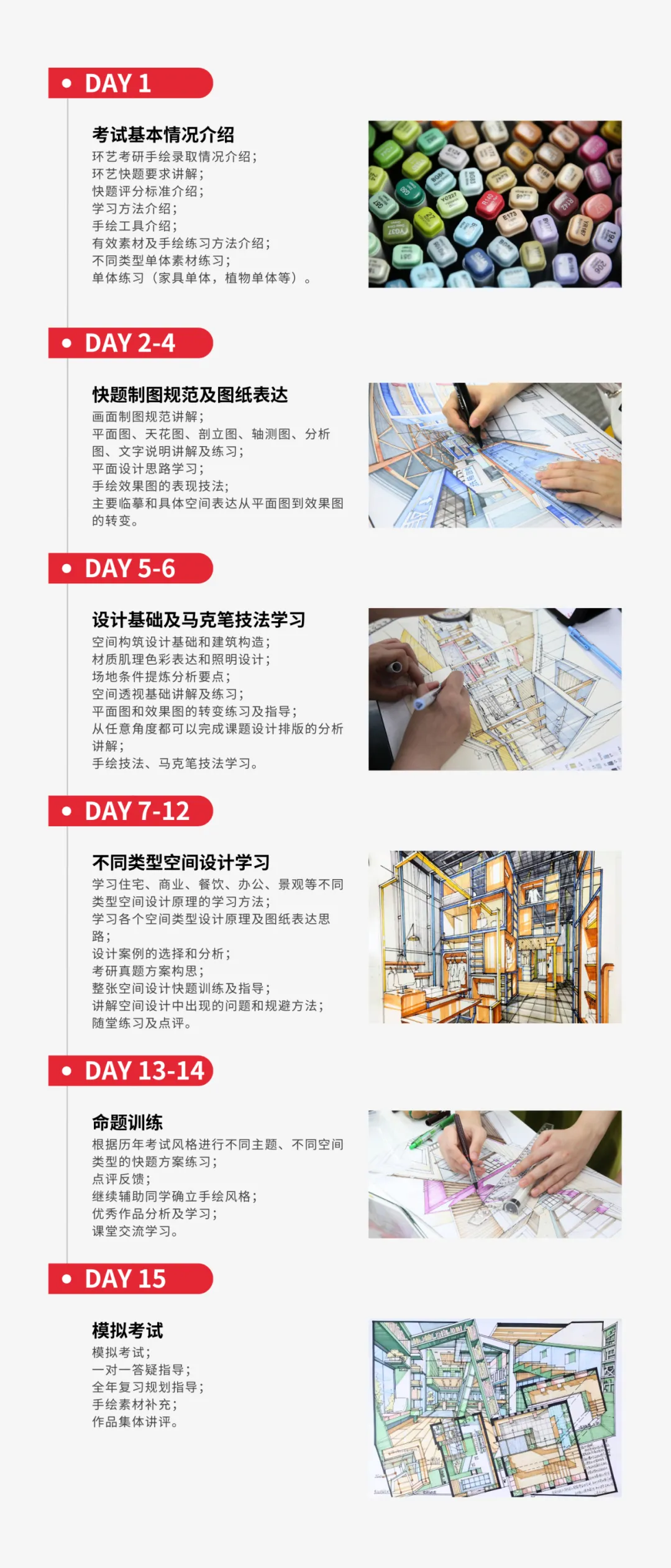 美然针对暑期推出的暑期培训班,助力同学完全掌握元素积累的方法及马克笔使用方法,熟悉不同主题的快题表达方法,完成完整的手绘快题;梳理理论知识网络,分析历年真题规律,分享前辈答题技巧等等……厚积薄发,高效提升!
