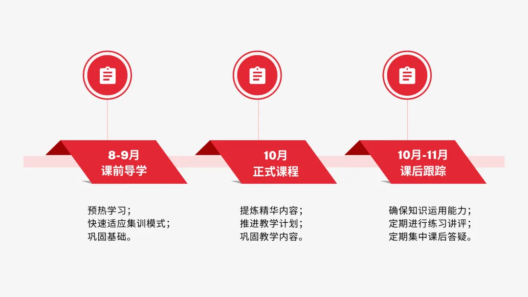 在暑期结束后才开始备考的零基础同学也无需困扰,美然教研组为保证基础薄弱的同学可以和大家同步推进,在国庆强化班开始前一个月开展预热导学课程,充分利用时间,巩固基础,查漏补缺,帮助同学更快适应课堂节奏。