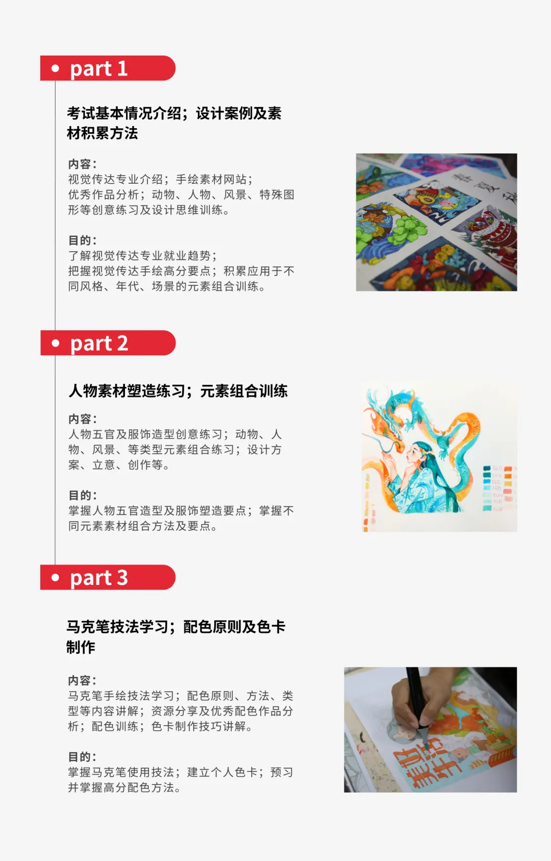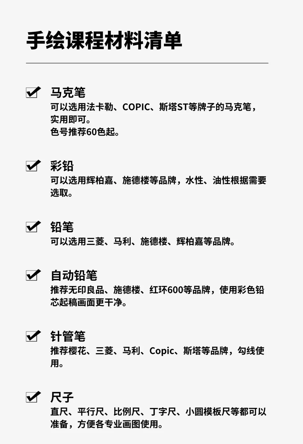 手绘预热课程三次课时,主要从院校专业介绍、画具准备、马克笔使用技巧、素材积累、初步塑造等基础性内容,帮助同学们了解院校考察方向、绘画技巧等,为后续系统快题训练打下基础。