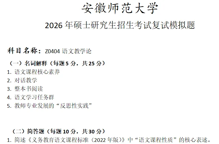>安徽师范大学Z0404语文教学论考研复试真题模拟