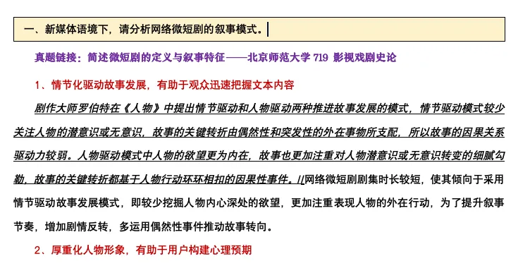 今年是广大参考书改革第二年,在考前我有担心题型会不会再改变,但还好今年题型设置和考题范围还是很稳定的,但是在出题风格、范围上还是有很大跳跃,可以说是近几年出题范围最广的一年。 第一题新传学院和人文学院的考生都需要回答的题目,这道题基本上是在《戏剧艺术十五讲》这本书,来探讨“戏剧和影视艺术的异同”,未来依然可能是这样的出题思路,相信大家也都有准备到。所以对于新传学院的考生来讲,需要重点关注《戏剧》这本书当中和影视交叉的部分,以及基本的戏剧概念。 第二题和第三题分别涉及到“韩国电影”和“现实主义电视剧”,依然是电影专题一道题、电视专业一道题,和往年的出题题路相似。但是和往年不同的是,今年是广州大学第一次涉及到“外国电影”,特别是东亚电影的领域,这个转变和学院近年的研究方向、学科体制改革也有很大关系。 在24级之前,广州大学的影视研究生统称为“广播电视专硕”,所属学科和教材全部是“电视、广播、新媒体”的研究方向,但是24级之后,广大包括全国的广电专硕统称为“戏剧与影视专硕”,这务必又囊括了电影、戏剧。 但是yysy,电影、戏剧的复习难度比单纯的广电更大,特别是包含中、亚、西方的电影史和电影理论,涉及到更宽、更广的知识维度。不过还好广大还是两本参考书,基础知识类的考题基本都是在参考书的范围中,所以对于27级考研同学来讲不必特别担心。 但是越越要强调一点,在27级往后的考研备考中,希望大家摒弃“划重点”的学习思路。因为26级的基础知识考题,尽管韩国电影、现实主义电影的知识点完全在参考书上,但是我观察下来很多同陷入学“划重点”“减少背诵量”的学习惯性,导致东亚电影、细分电视剧的再分类问题是没有注意到的。 这个以往考研也出现过这样的情况,22、23级连续两年考到了电视广告的分类,这个知识点在教材上只有一行字,在名词解释都不够写的情况下,却直接考了一道简答题🤯。 所以在未来的考研复习、备战过程中,我们争取学习、背诵到教材方方面面的内容,甚至书本上不完善、没有答题框架的内容还要继续补充、整理,我们辅导团队也会在今年重新更新资料,保证大家的学习全面性。 再次是论述题,论述题今年考到了竖屏微短剧和纪录片,这两道题我们之前都有训练过,也是得益于大家考前跟着我们一步步背过那么多影视热点、学科论文的结果👏,很多同学反馈说论述题写的不错,大分值的题目基本上保证自己的总分值。 但是大家可以注意一下第二道题,问的是“ 中国纪录片的类型化发展”,这道题一方面偏向热点,让大家分析纪录片的热门类型总结,但同时这是一道“学术议题”的题目,并不是单纯考查热点积累能力,其实更多是一种整理、归纳,以及对于学科整体的理解问题。简而言之,再没有直接准备题目的情况下,有一定“思考力”的同学回答这道题更能得高分。8月23 为什么要强调这个问题呢?因为25年我们经历了AI技术产品的变革,大部分同学的思考能力以及被豆包、Deepseek取代了,如果平时遇到这类问题,直接在对话框一输入,豆包一分钟之内就给你输出最佳答案,我们也就“理所应当”的认为自己已经理解了,学会了。 但是越越认为,这个过程其实并不是学习的过程,你只是在单向度、碎片式的积累知识,但是这些知识在大脑里并不形成框架,以及最重要的“思考过程”并没有在大脑里形成方法论。 比如这道题,纪录片类型化发展,准备这类问题我们需要先储备1️⃣遇到历史类、发展类问题的答题框架。2️⃣纪录片的类型化时期、特征。 3️⃣不同时代的纪录片代表作品 4️⃣单一时期的类型发展表达逻辑,论证思路。 以上是我们平时需要积累的知识板块、答题思路,即便它不问这道题,问到其他任何题材、类型的影片我们都能够对答如流。 小知识💡:这道题其实是在广大张爱凤老师的论文中可以看到影子,在考研初期我给班里的同学强调过,所以关注出题老师论文也是十分重要的!以上就是我对634的整个的题目分析,下一期我们针对专业二854进行详细探讨,也欢迎同学们在评论区分享大家的考场感受和考后总结~