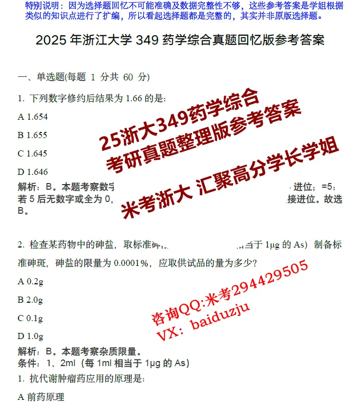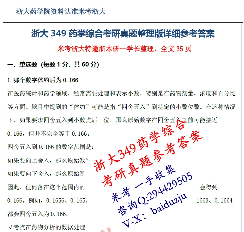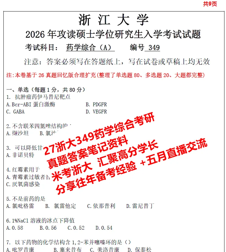 一、浙大 349 药学考研真题 2023-2026详细整理版及参考答案