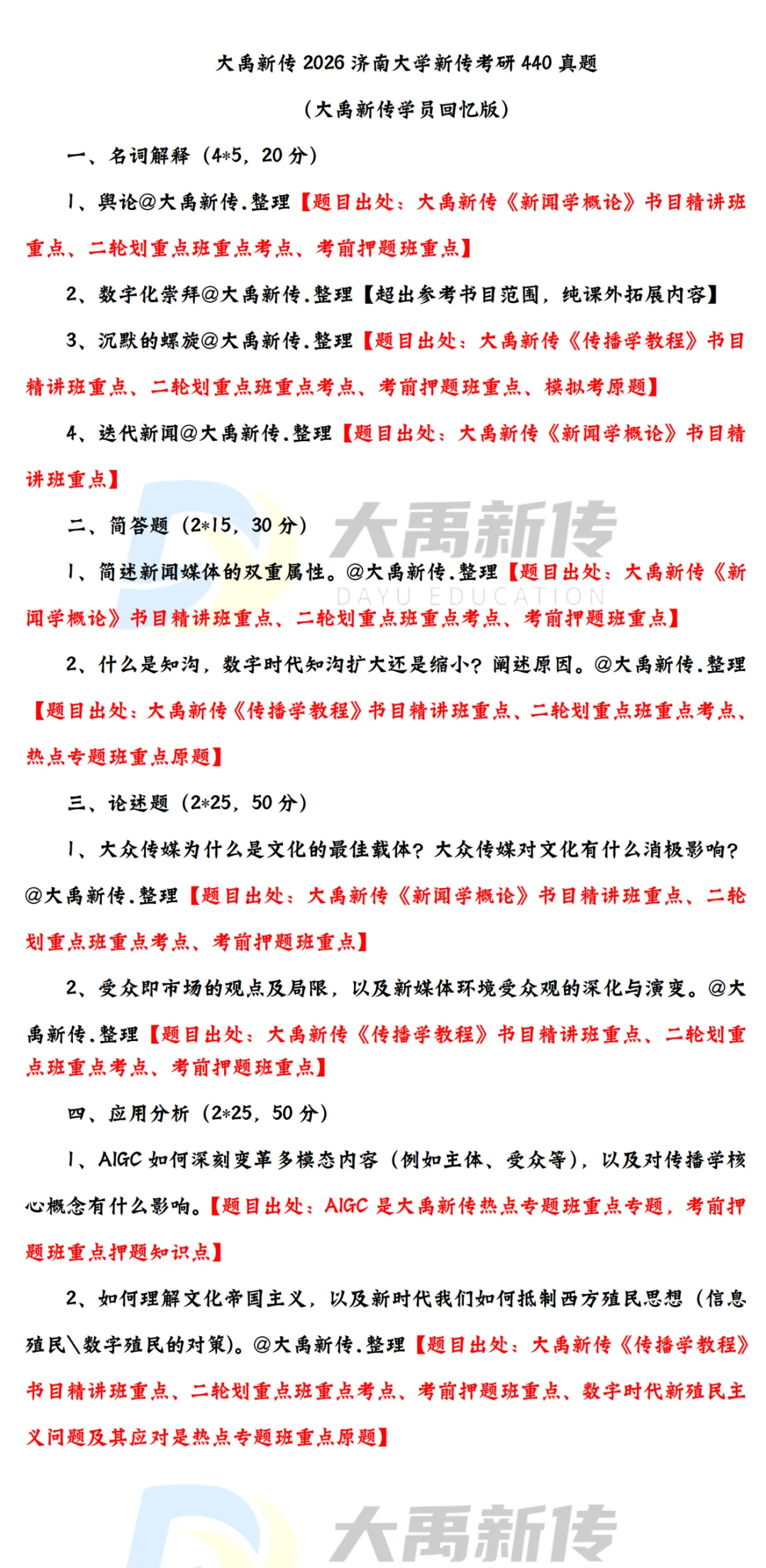 刚刚过去的2026考研初试里,作为系统化开设济南大学新传考研辅导小班的机构,@大禹新传在 2026 济南大学新传考研中再创佳绩 ——考试内容3/4为课程强调的重点考点或原题,涉及分值超200分!