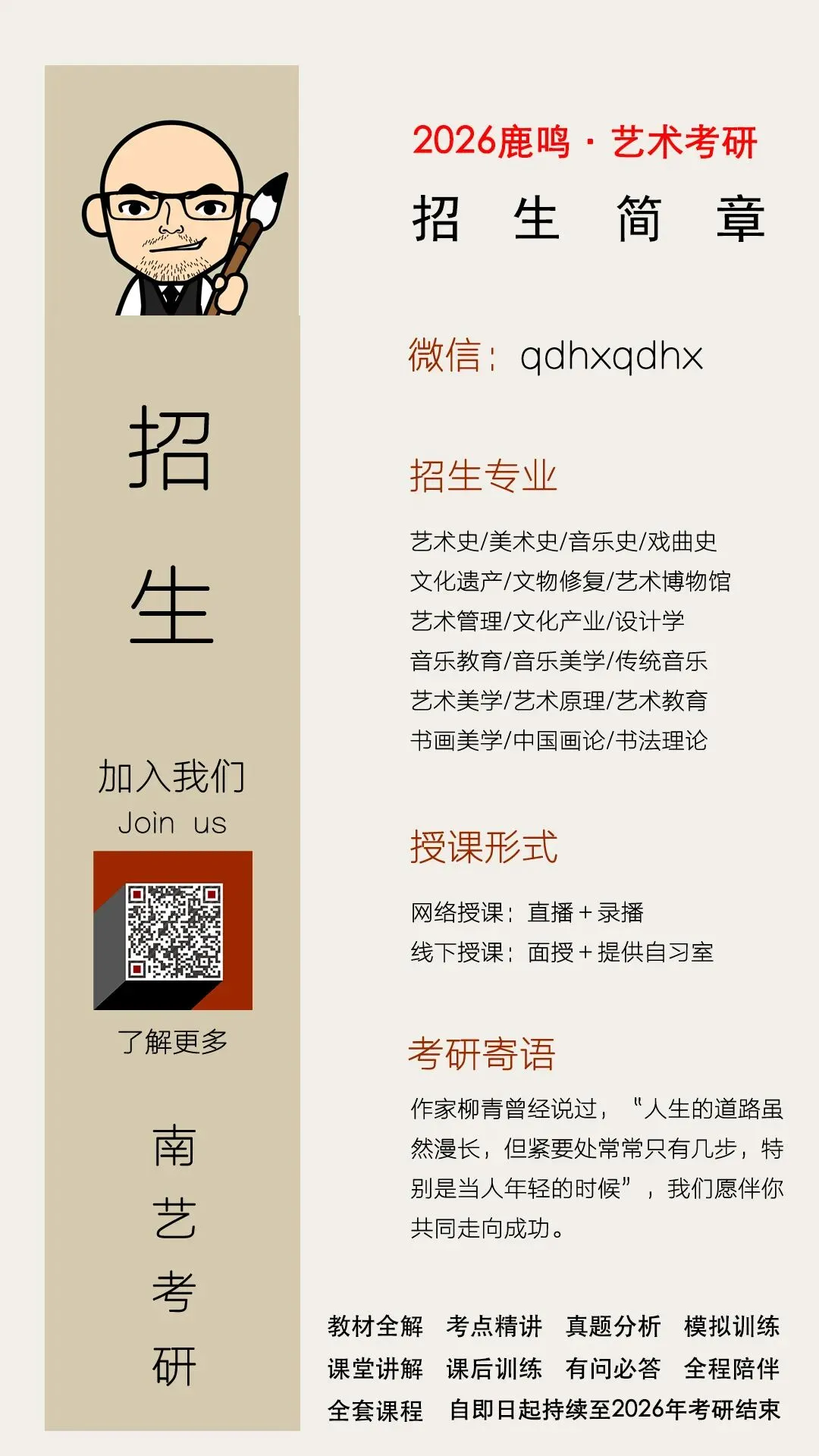 2016年起,我们创办了“鹿鸣·艺术考研”培训机构,陆续帮助百余名同学考入南京艺术学院、中国艺术研究院、上海戏剧学院、广西艺术学院、山东艺术学院、南京师范大学等高等院校。作家柳青曾经说过,“人生的道路虽然漫长,但紧要处常常只有几步,特别是当人年轻的时候”,董哥愿伴你共同走向成功。