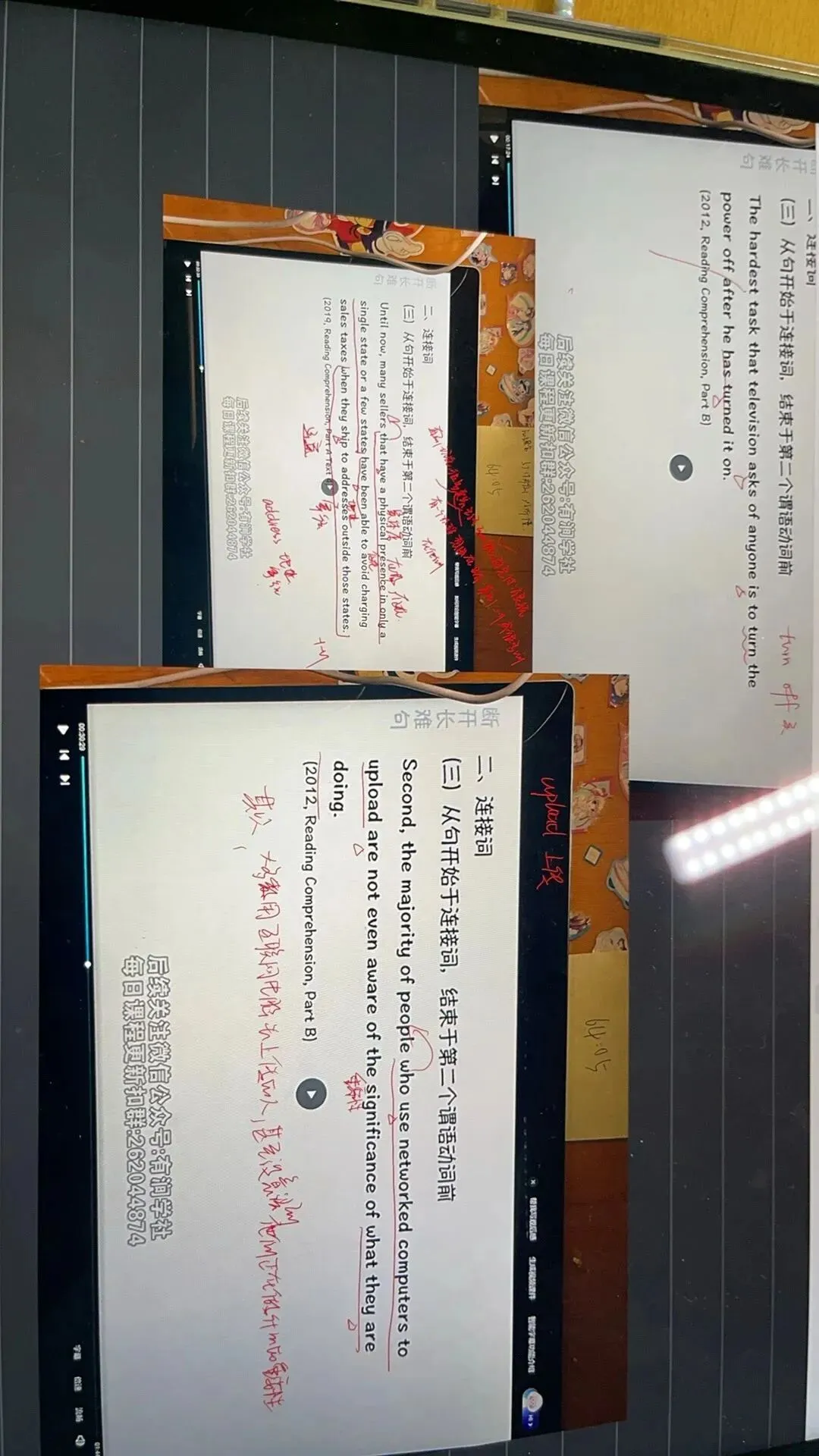 阅读我听了唐迟的技巧课,并搭配田静的阅读课来学习,因为单纯使用技巧,我觉得有点不踏实,还是需要真正读懂单词含义,明白文章讲的意思。田静的阅读课对我这种基础很差的同学来说,很好用,她会把生词的翻译还有派生词整理出来,课上会翻译每个句子,我可以把不会翻译的超级长难句,学着她的方法翻译。边听课,我也会把生词写在一张A4纸上,每套卷子都整理一份单词,在备考后期,可以直接背诵自己曾经整理过的单词资料,很方便。完形填空我听的是易熙人老师的课,翻译听的是唐静老师,新题型听的是刘琦老师,作文听的是石雷鹏老师,按照石雷鹏老师的要求,把每一篇作文都背下来并流畅默写,能够完全理解,学习汉语思路。