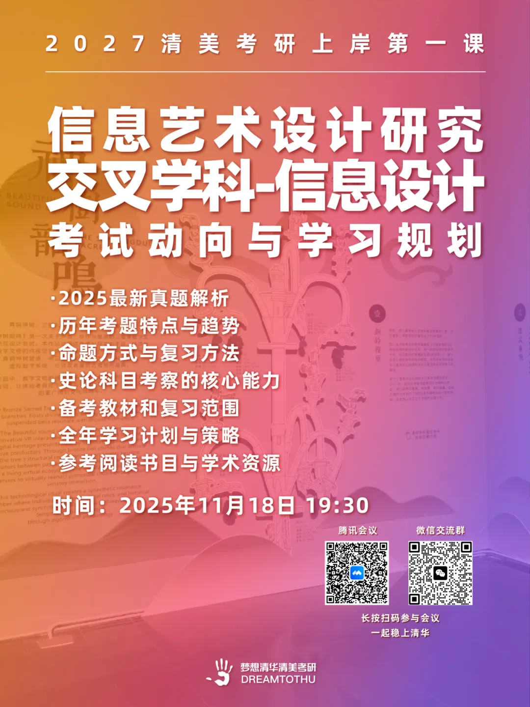 针对2027年清华美院考研学子,我们筹备了覆盖所有专业的备考指导系列课程,致力于成为你稳稳上岸的第一课!课程内容涵盖院校专业剖析、导师解读、最新考情、专业课要求与学习方法,以及全科目复习规划。错过直播的同学,请立即联系教务老师获取回放链接。