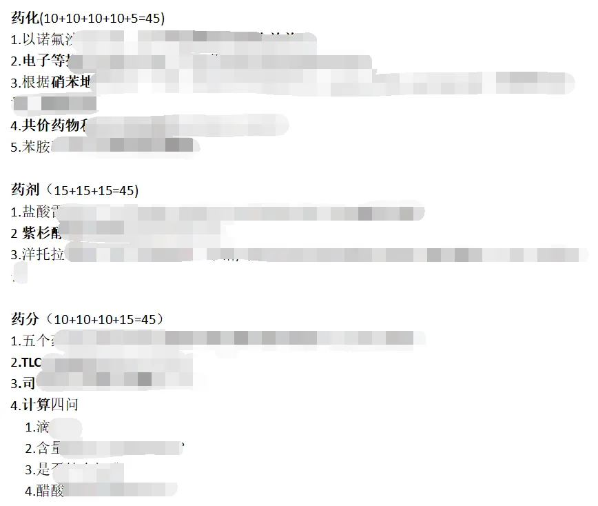 总的来说,药化部分:除了共价药物与非共价药物、双氯芬酸钠的合成这两道比较偏的题,药分部分:GLP、GSP等的名词解释、由于时间问题没讲的各论部分(司可巴比妥钠含量测定方法)以及药理最后的两道拓展题,其余的我们都是有讲到的哦。希望大家可以能拿到自己的理想成绩,学姐再次祝福大家!