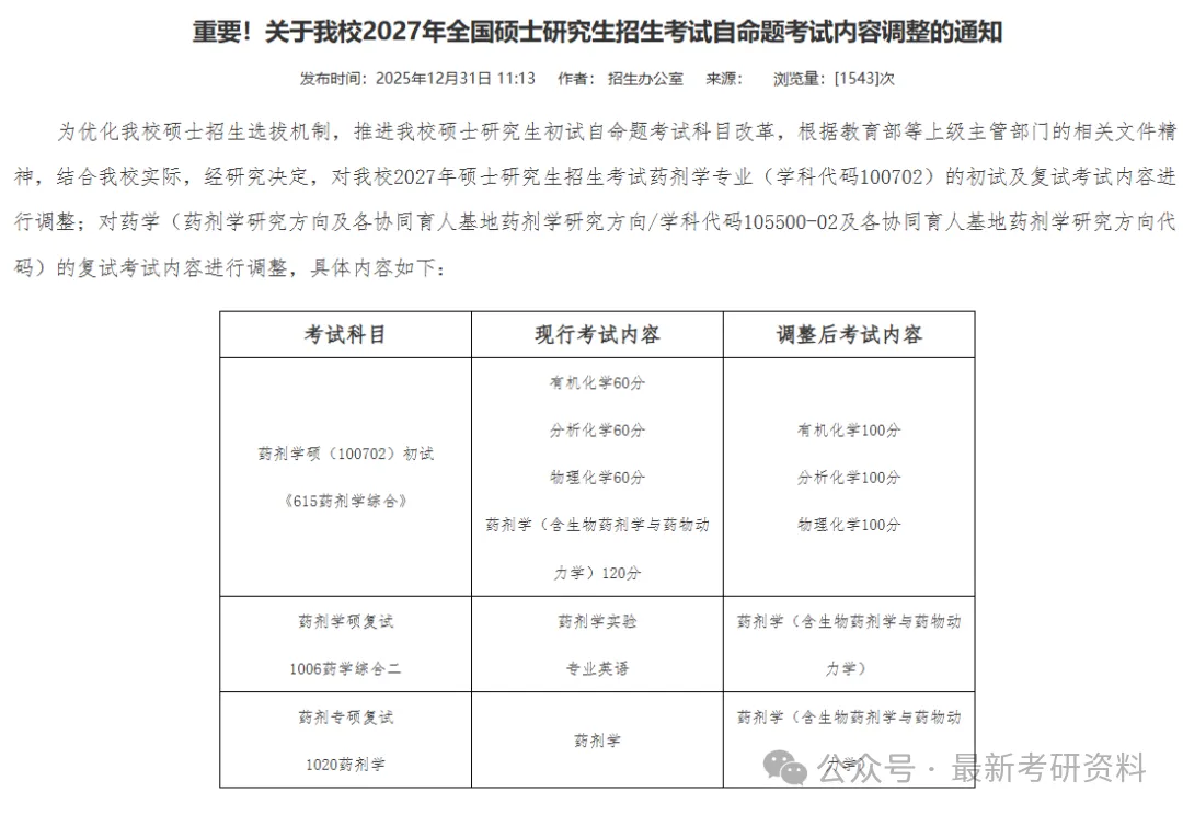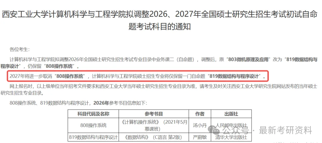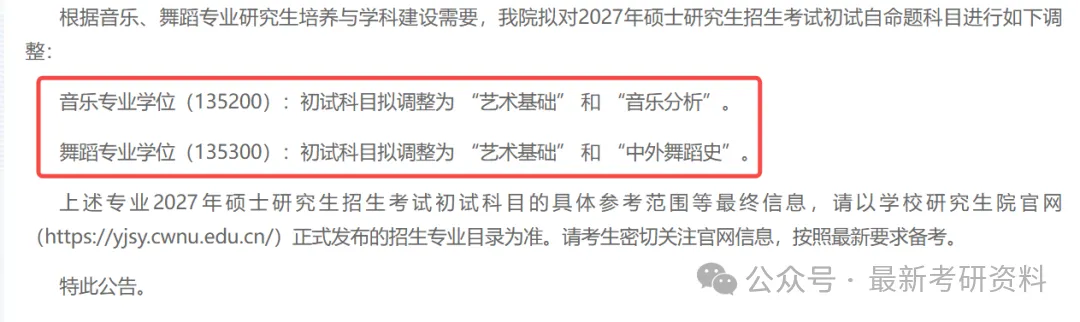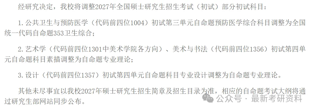 西安工业大学计算机科学与工程学院发布了拟调整2026、2027年全国硕士研究生招生考试初试自命题考试科目的通知。2027年将进一步取消“808操作系统”,计算机科学与工程学院硕士招生专业将仅保留一门自命题“819数据结构与程序设计”。🔗https://cs.xatu.edu.cn/info/13885/195058.htm西华大学发布了关于2027年音乐、舞蹈专业学位硕士研究生入学考试初试科目调整的公告。根据音乐、舞蹈专业研究生培养与学科建设需要,我院拟对2027年硕士研究生招生考试初试自命题科目进行如下调整:音乐专业学位(135200):初试科目拟调整为 “艺术基础” 和 “音乐分析”。舞蹈专业学位(135300):初试科目拟调整为 “艺术基础” 和 “中外舞蹈史”。🔗https://music.cwnu.edu.cn/info/1561/39061.htm佳木斯大学发布了关于调整2027年全国硕士研究生招生考试(初试)部分初试科目的公告。1.公共卫生与预防医学(代码前四位1004)初试第三单元自命题预防医学综合科目调整为全国统一代码自命题353卫生综合;2.艺术学(代码前四位1301中美术学院各方向)、美术与书法(代码前四位1356)初试第四单元自命题科目素描调整为自命题专业理论;3.设计(代码前四位1357)初试第四单元自命题科目专业设计调整为自命题专业理论。🔗https://yjs.jmsu.edu.cn/info/1061/3458.htm沈阳药科大学发布了关于我校2027年全国硕士研究生招生考试自命题考试内容调整的通知。对药剂学专业(学科代码100702)的初试及复试进行调整。🔗https://grs.syphu.edu.cn/info/1016/12703.htm吉林师范大学发布了关于调整2026年、2027年硕士研究生招生考试专业目录有关事宜的公告。自2027年起,英语语言文学、俄语语言文学、日语语言文学、亚非语言文学专业初试科目二由自命题科目调整为全国统一命题科目。此外,还涉及到多专业自命题改考。🔗https://www.jlnu.edu.cn/yjsy/info/1032/2780.htm参考以上院校的改考信息,可以看到: